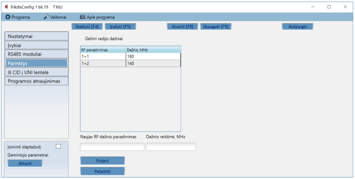 Galima Pridėti/Pašalinti radijo dažnius prie sąrašo, kuriuose gali dirbti siųstuvas T16. Radijo dažniams suteikiami „Pavadinimai“.
