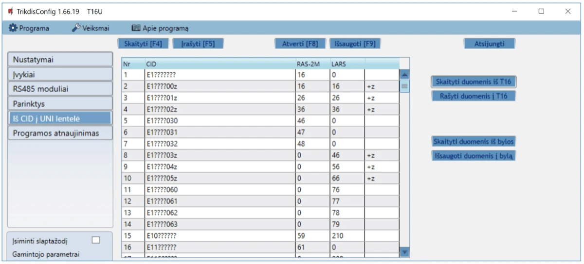 Contact ID kodai, gauti iš signalizacijos centralės, konvertuojami į radijo sistemos (RAS2M, LARS) kodus. Tik Contact ID pranešimai, aprašyti lentelėje (CID stulpelis), yra konvertuojami į radijo sistemos kodus ir perduodami CSP. Simbolis "?" reiškia bet kurį skaičių pozicijoje. Simbolis "z" reiškia, kad numeris pozicijoje pridedamas prie pagrindinio radijo sistemos kodo. Lentelė redaguojama, tačiau prašome padaryti tai atsakingai ir tik tuo atveju, jei tai tikrai būtina, nes jei lentelėje atsiras klaidų, sistema gali netinkamai veikti.