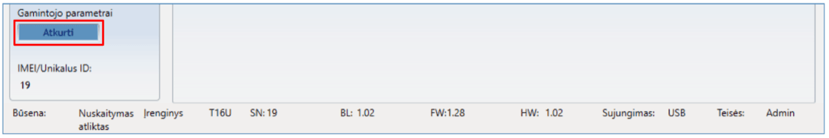 Norint atkurti siųstuvo gamyklinius nustatymus, reikia nuspausti programos TrikdisConfig mygtuką Atkurti.
