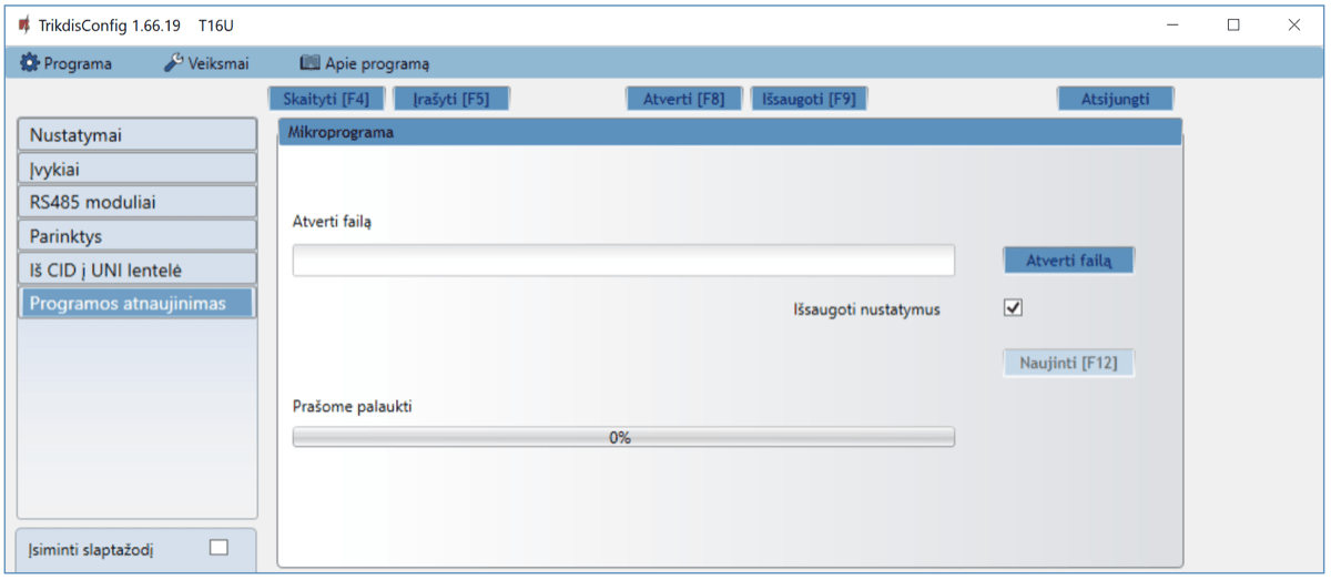Paspauskite gamyklinės programinės įrangos atidarymo langelį Atverti failą ir parinkite reikiamą gamyklinės programinės įrangos bylą. Jei neturite bylos, naujausią gamyklinės programinės įrangos bylą galite parsisiųsti kaip registruotas vartotojas iš www.trikdis.com , pagal T16 parsisiuntimo sekciją.