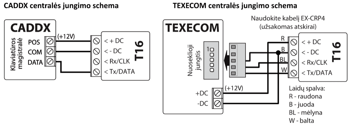 | Rx/CLK | Apsaugos centralės nuoseklaus prievado gnybtas CLK |