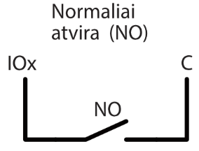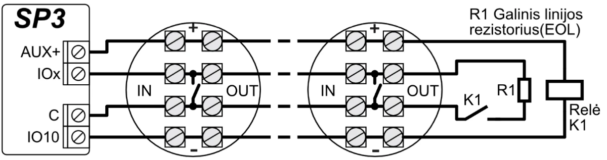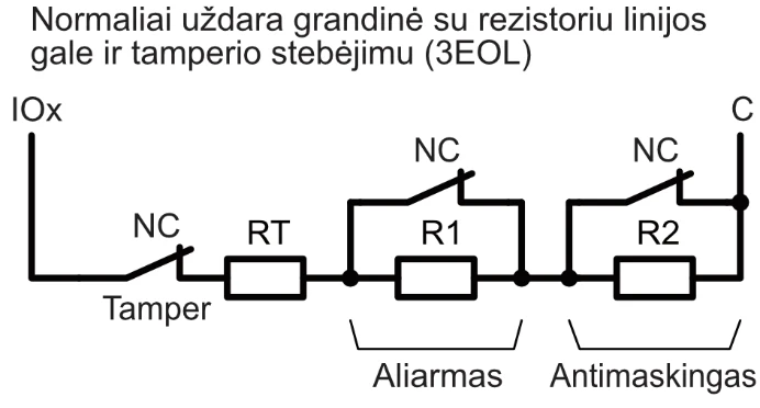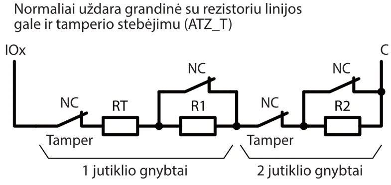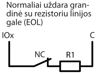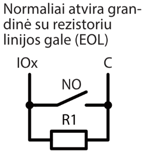 | Dvigubos paskirties kontaktai [I/O] | 10 Programuojant nustatoma IN arba OUT funkcija. Kai nustatyta IN, galima priskirti tipą: NC, NO, EOL, EOL_T, 3EOL, ATZ, ATZ_T. Kai nustatyta OUT, kontaktas tampa atvirojo kolektoriaus (OC) tipo išvadų, komutuojančiu iki 100 mA srovę |