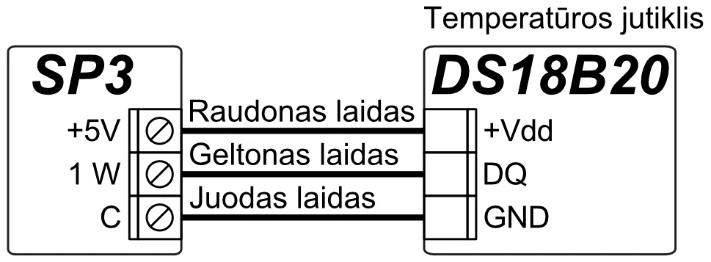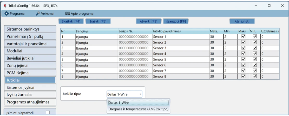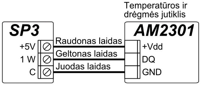 | Didžiausias temperatūros jutiklių, jungiamų prie 1-Wire magistralės, skaičius | 8 (Dallas) arba 1 (jei naudojamas AM2301 serijos jutiklis) |