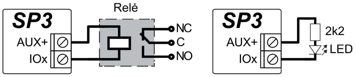 Plokštėje yra 2 dedikuoti išėjimai – „Bell“ ir „LED“. „Bell“ skirtas valdyti sireną, o „LED“ – šviesinius indikatorius. Su iO, iO-8, iO8-LORA, iO-LORA, REL-LORA ir iO-WL plėtimo moduliais išėjimų skaičių galima išplėsti iki 16.