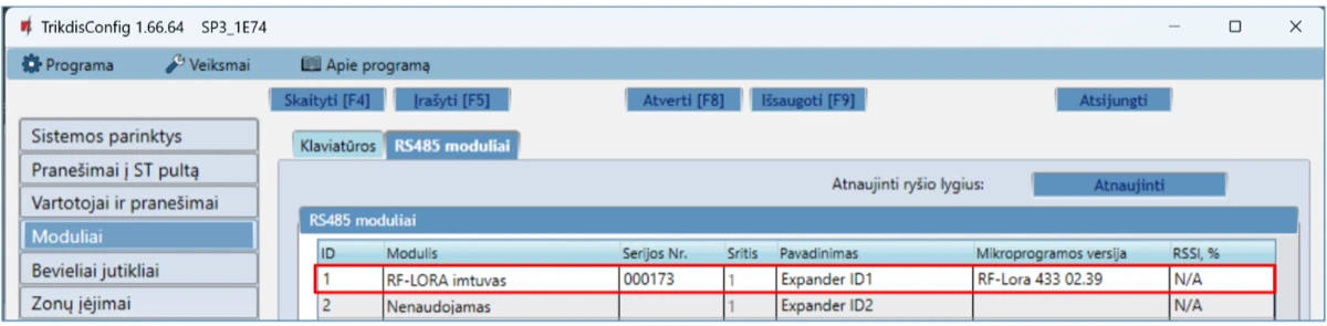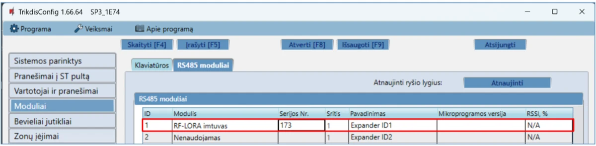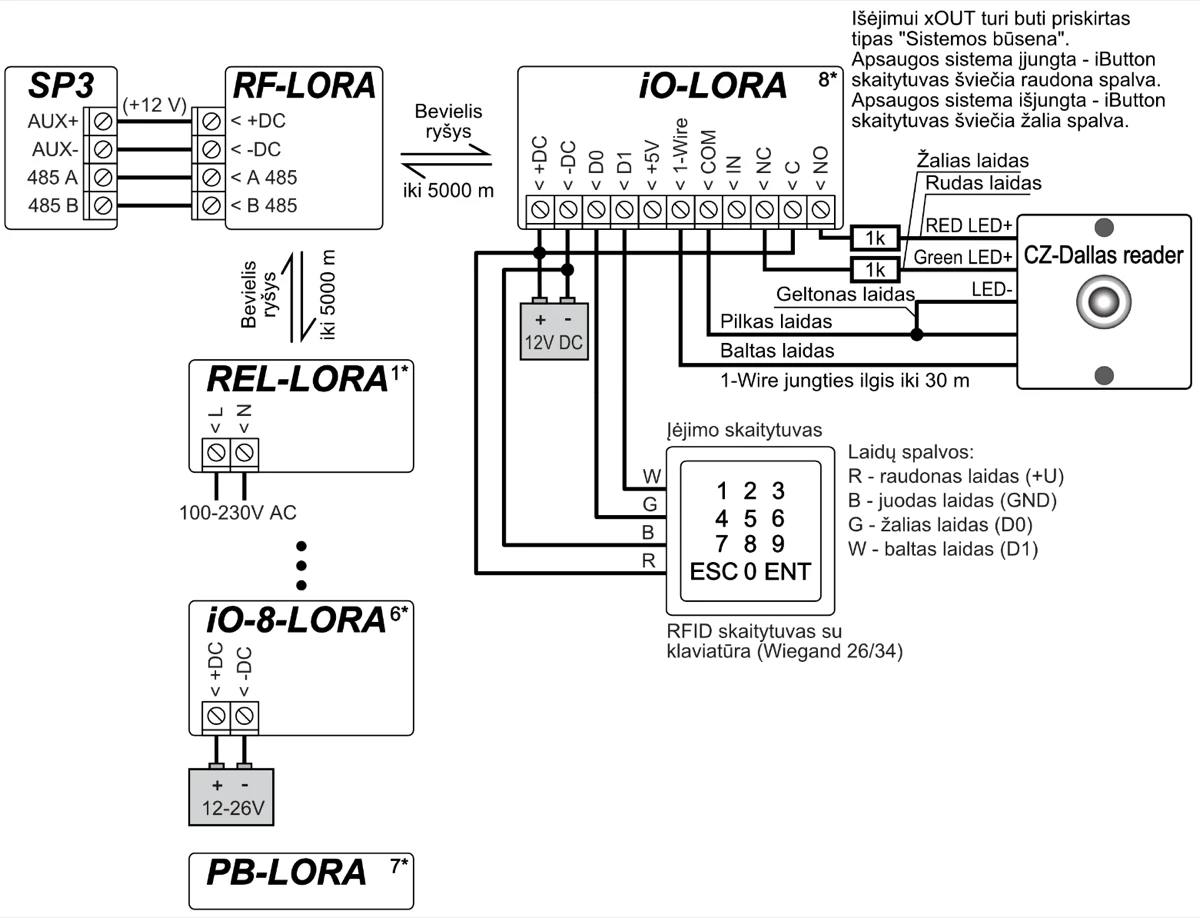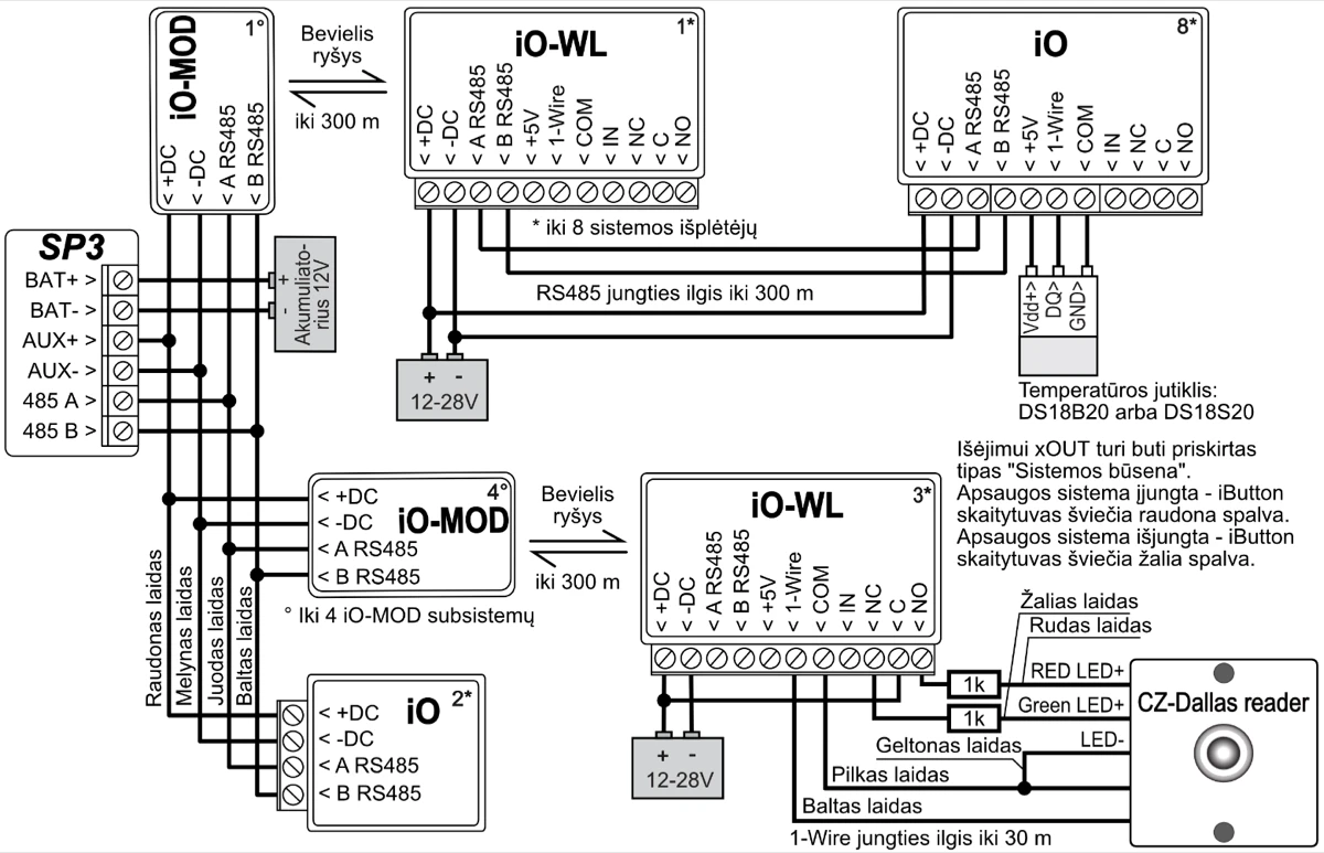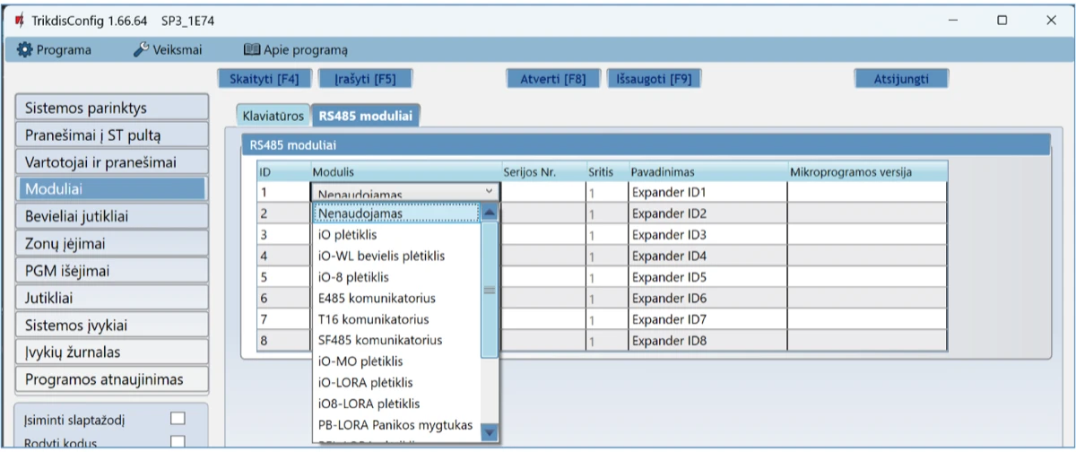 | Palaikomi moduliai | iO-8 - plėtimo modulis; / iO – plėtimo modulis; / iO-MOD – iO-WL radijo bangų imtuvas; / iO-WL – bevielis plėtimo modulis; / RF-SH – bevielių jutiklių radijo bangų imtuvas; / RF-HW - bevielių jutiklių radijo bangų imtuvas; / RF-S8 - bevielių jutiklių radijo bangų imtuvas / RF-LORA - bevielių LORA jutiklių radijo bangų imtuvas; / E485 – prijungimo prie „Ethernet“ tinklo modulis; / TM17 – iButton raktų skaitytuvas; / CZ-Dallas – iButton raktų skaitytuvas; / T16 – VHF arba UHF radijo bangų siųstuvas; / SF485 – prijungimo prie Sigfox tinklo modulis; / iO-LORA – plėtimo modulis; / iO8-LORA – plėtimo modulis; / PB-LORA – panikos mygtukas; / REL-LORA – relinis modulis; / RFID skaitytuvas. |
