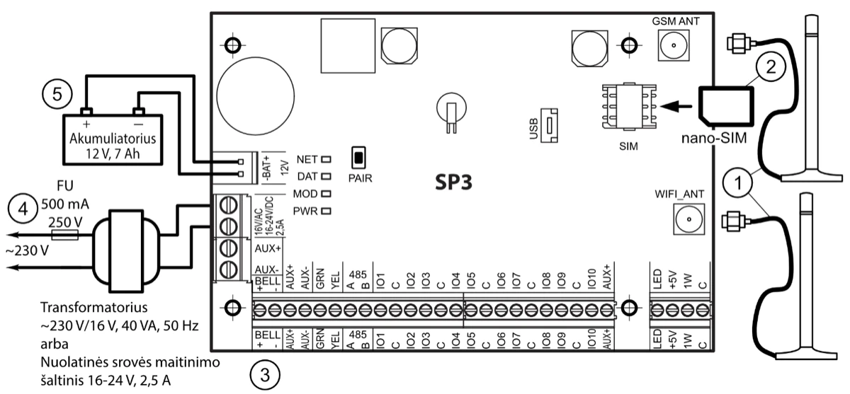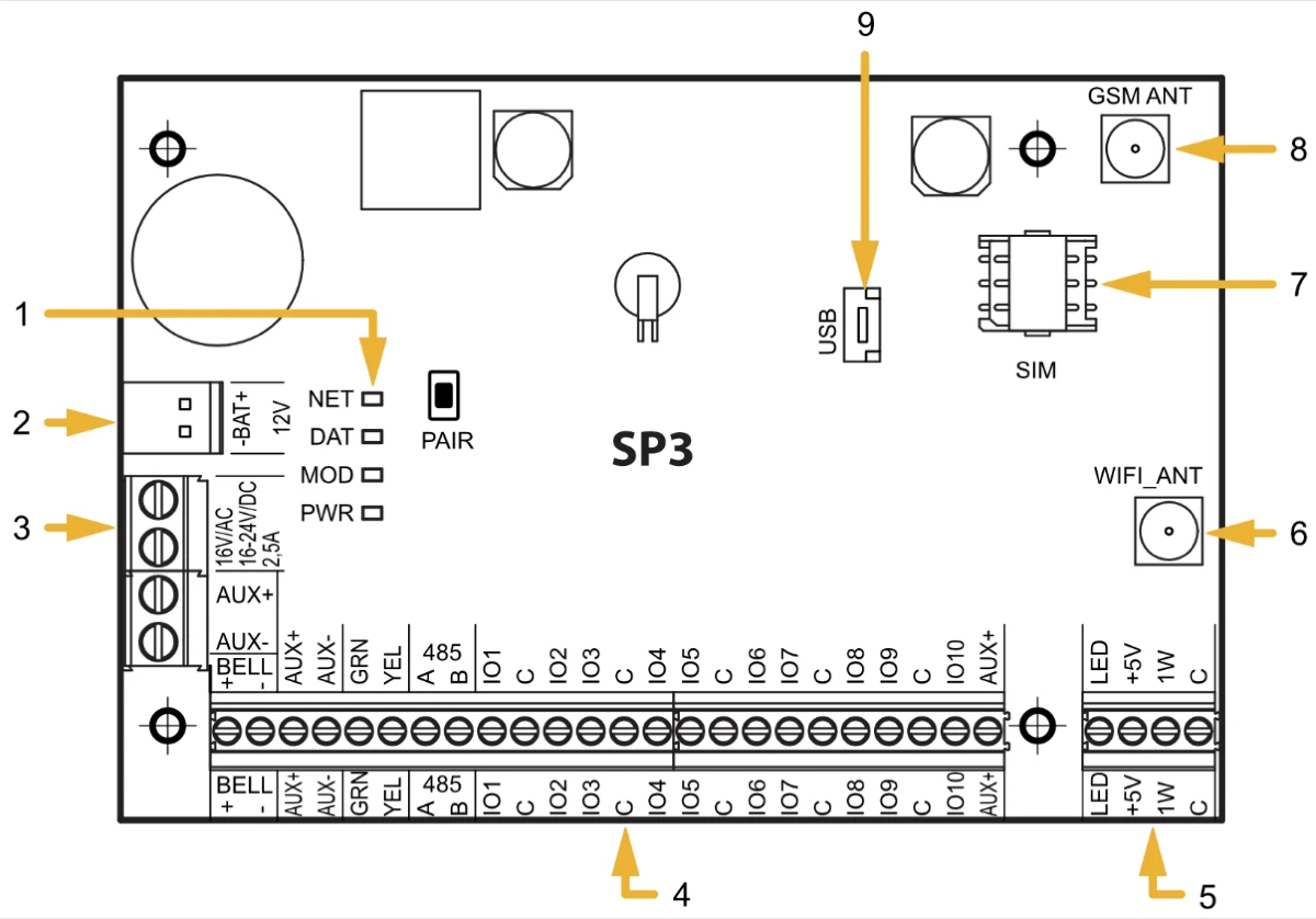 | Įvykių pranešimų perdavimo kanalai | GPRS arba 4G, WiFi, LAN (moduliu E485), SMS, Balso skambutis (iki aštuonių numerių. Apsaugos centralei SP3_12xx su programinės aparatinės įrangos versija iki 1.13 imtinai), VHF/UHF radijo ryšiu (siųstuvu T16), Sigfox (moduliu SF485) |