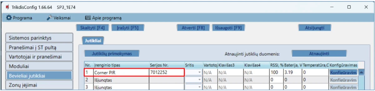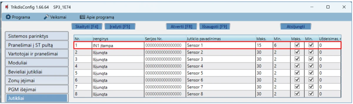 Serijos Nr. - temperatūros jutiklio serijos numeris, kurį nuskaito centralė.