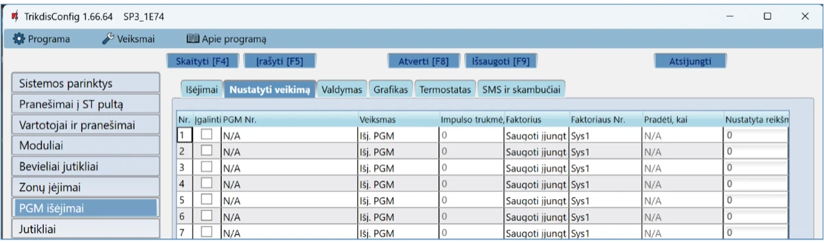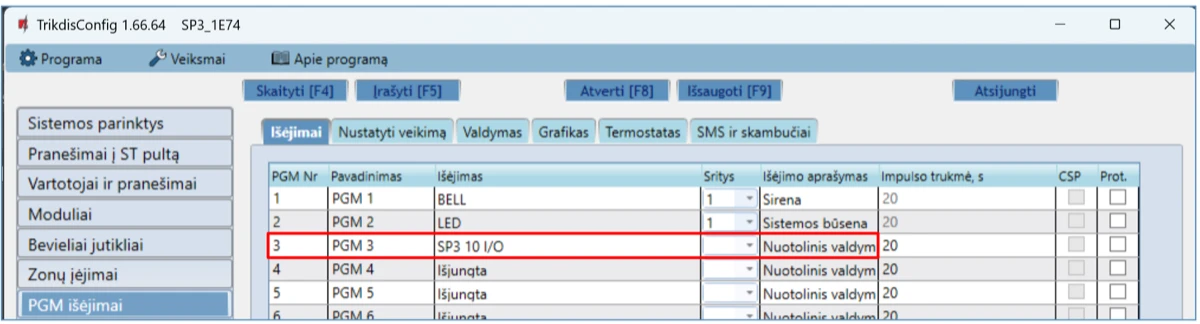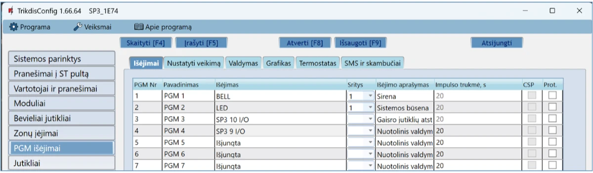 Norėdami išbandyti centralės išėjimus (PGM), juos įjunkite nuotoliniu būdu ir patikrinkite jų veikimą.