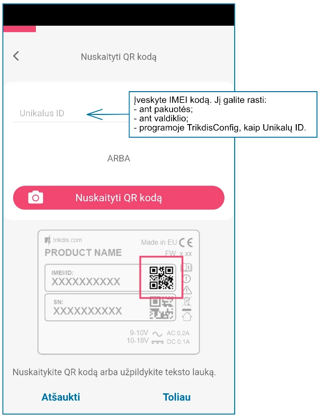 Lauke „Nuotolinė prieiga“ įveskite centralės „IMEI/Unikalus ID“ numerį. Šį numerį rasite ant įrenginio pakuotės ir nugarėlės lipduko.