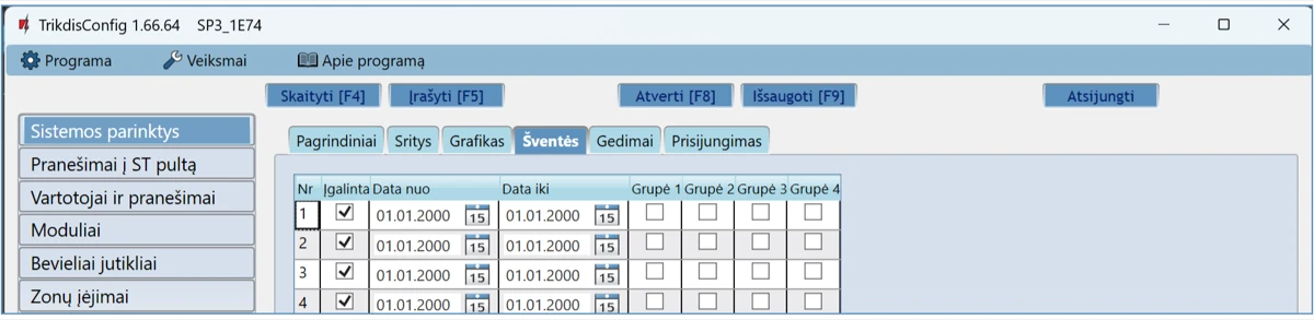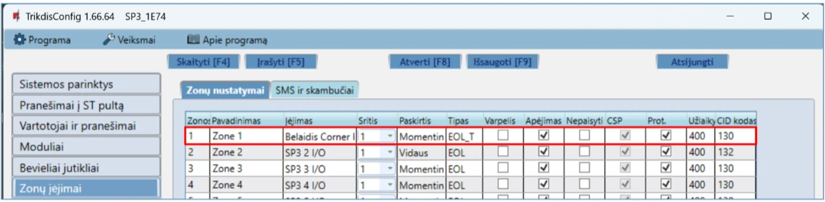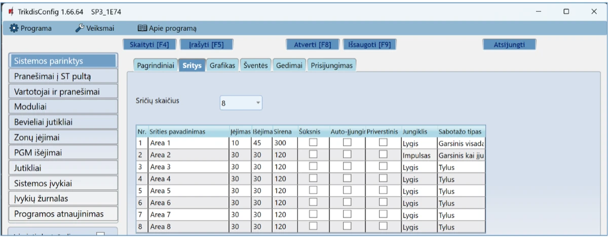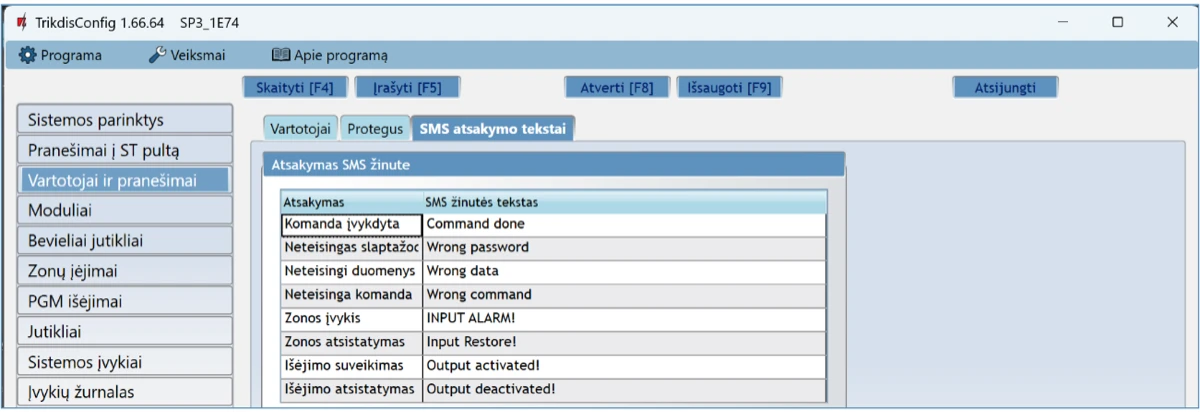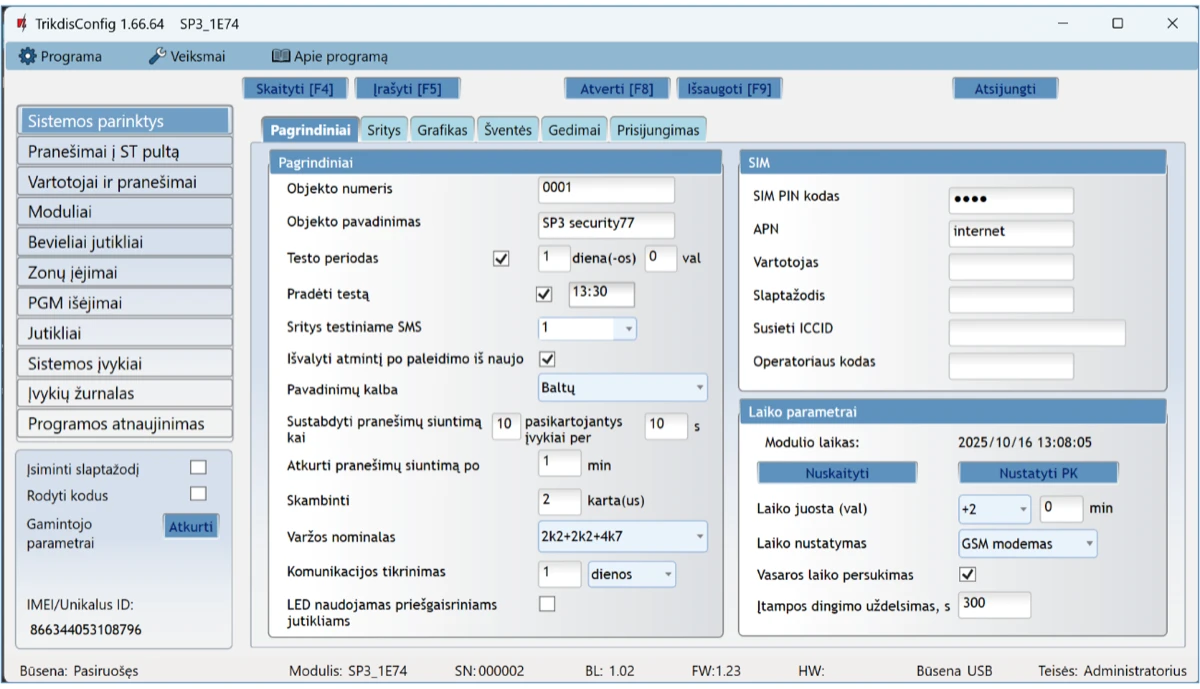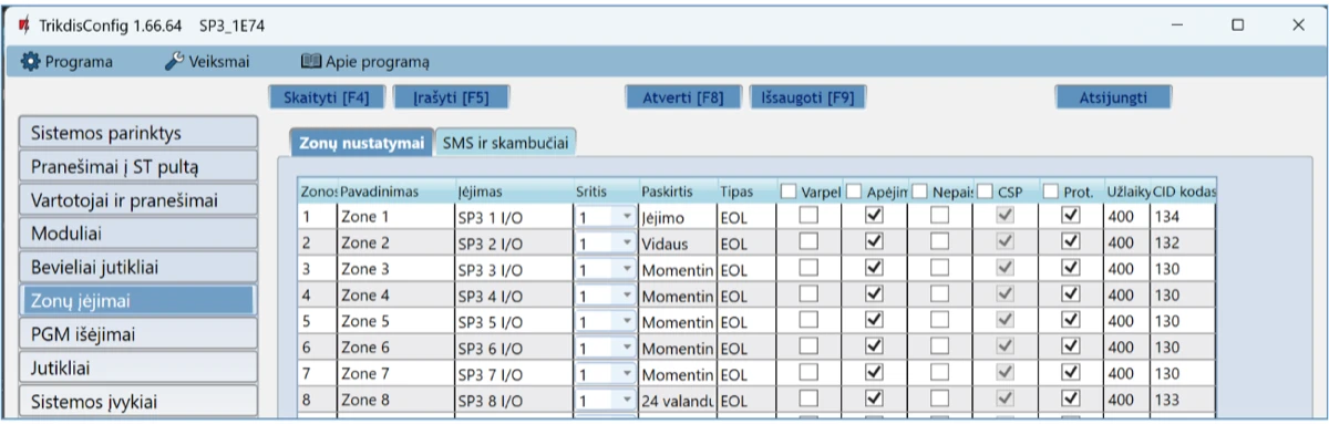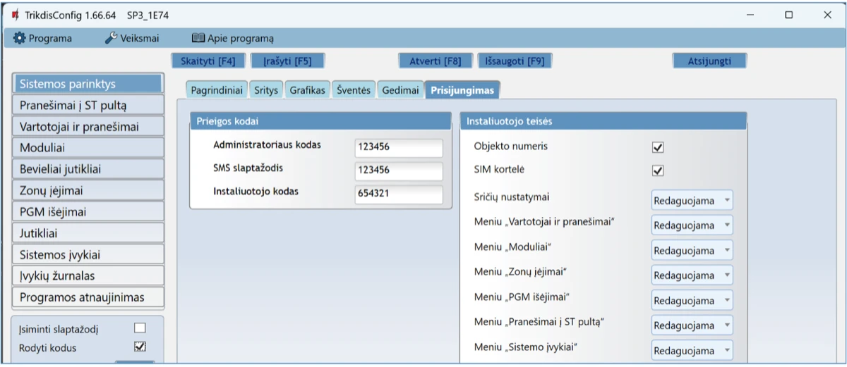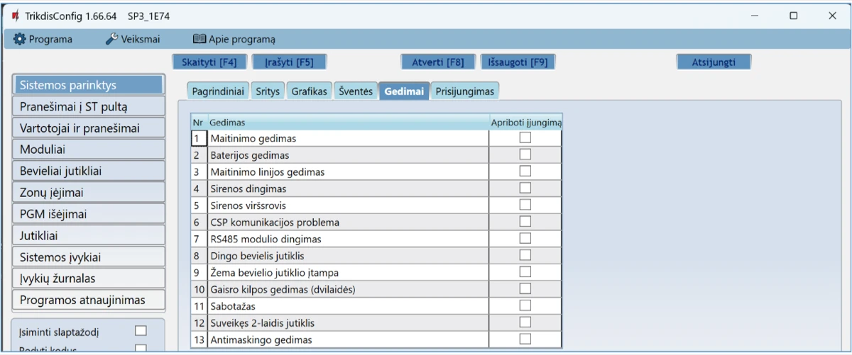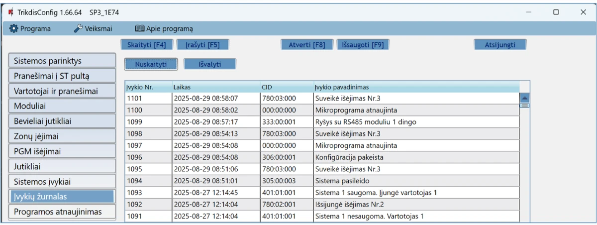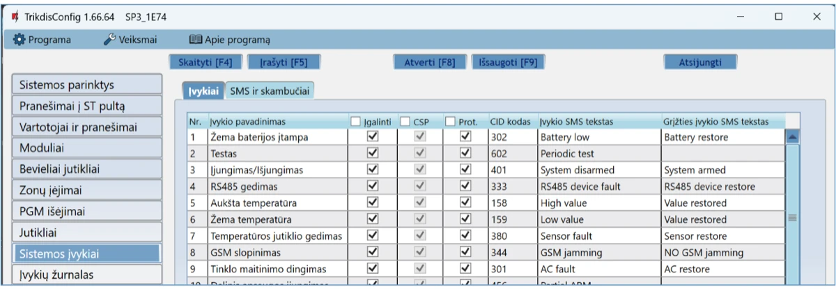 Prisijungus nuotoliniu būdu TrikdisConfig programa, galima ne tik keisti centralės „FLEXi” SP3 sisteminius parametrus, bet ir stebėti jos veikimą.
