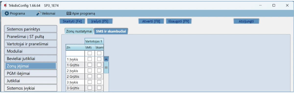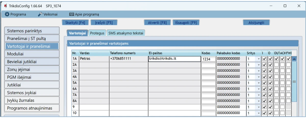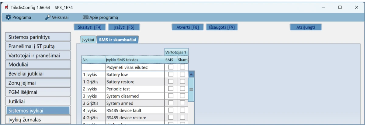 Vartotojas / SMS ir Skambutis – pažymėkite, kokiu būdu vartotojai turi būti informuoti apie kiekvieną įvykį – SMS žinute ir/arba skambučiu.