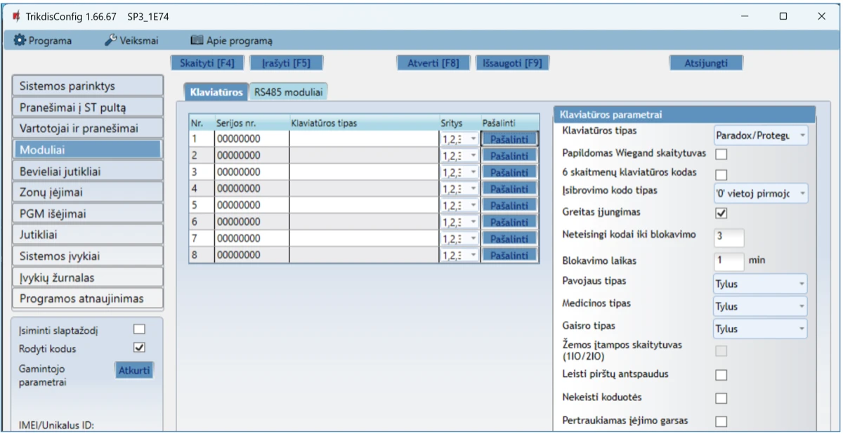 | Specialus apsaugos išjungimo kodas, reiškiantis, kad apsauga išjungta panaudojus prievartą (angl. Duress code) | Programuojant galima parinkti du vartotojo kodo surinkimo būdus |