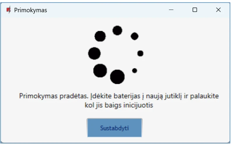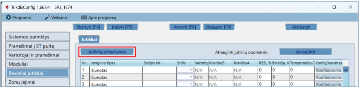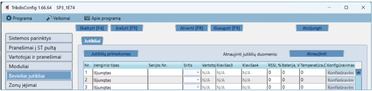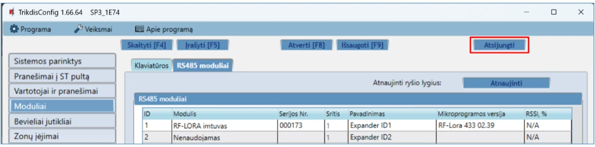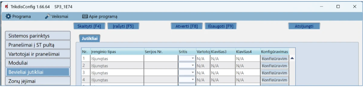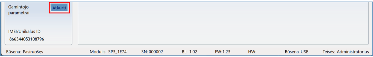 Norint atkurti centralės gamyklinius nustatymus, reikia nuspausti programos TrikdisConfig mygtuką „Atkurti“.