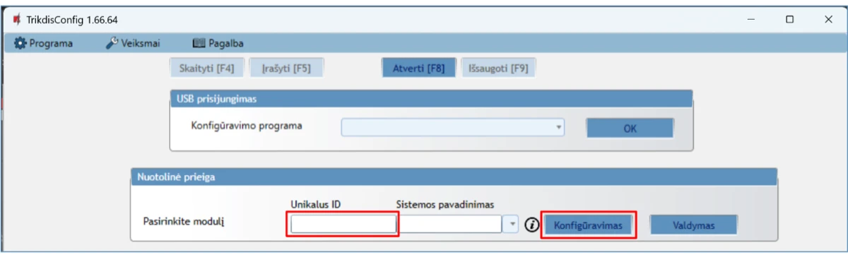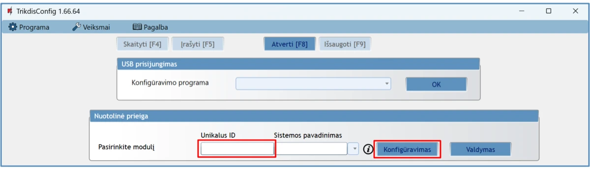 Įrenginio konfigūravimas galimas TrikdisConfig programa prisijungus USB kabeliu arba nuotoliniu būdu,.