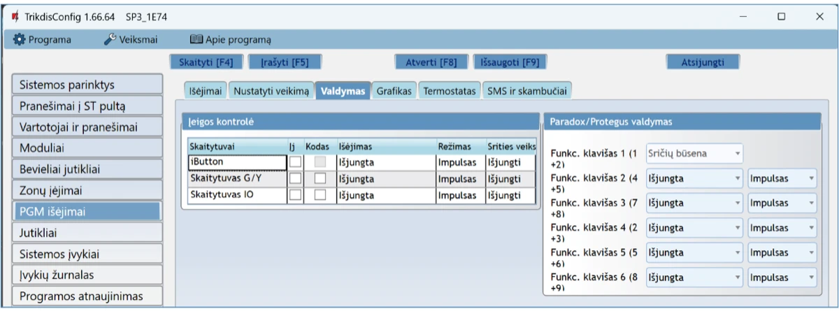 - Funkcinis klavišas – paspaudus ir palaikius funkcinius klavišus 3 sekundes, suveiks PGM išėjimas. Pasirinktas PGM išėjimas (jam turi būti nustatytas Nuotolinio valdymo režimas) suveiks impulso trukmei (jei nustatytas Impulsas darbo režimas) arba pasikeis PGM išėjimo signalo lygis (jei nustatytas darbo režimas Lygis).