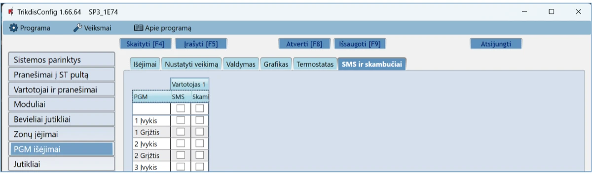 Vartotojas / SMS ir Skambutis – galite parinkti, kurį vartotoją SMS žinute ar/ir skambučiu informuoti, kada OUT išėjimas bus įjungtas/išjungtas.