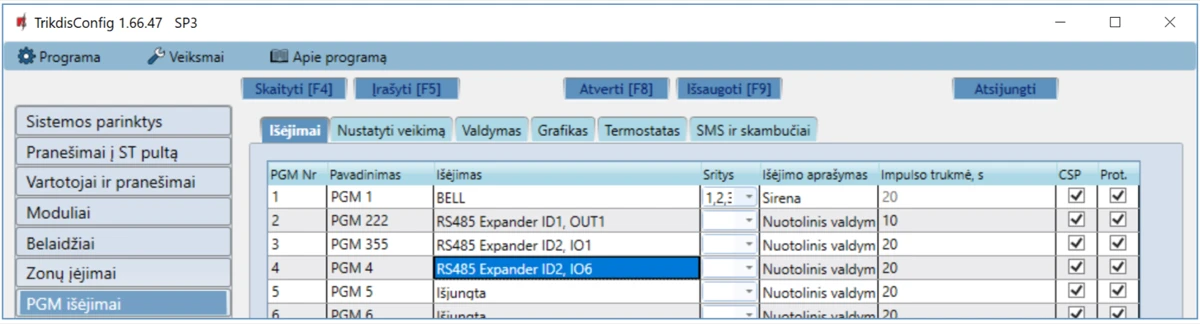 - "PGM išėjimų" sąraše atlikite nustatymus plėtiklio PGM išėjimams.
