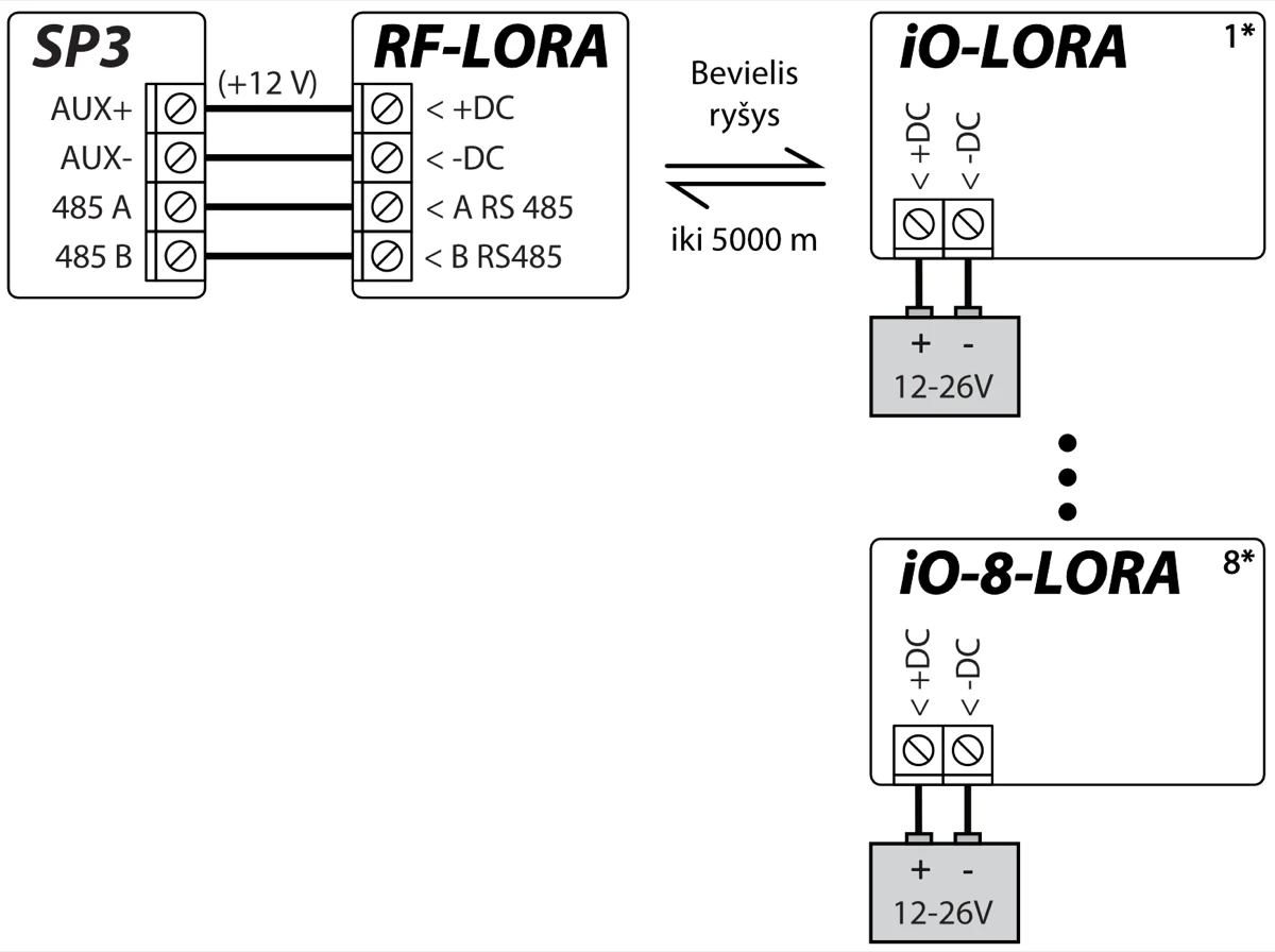 - Transiveris RF-LORA prie apsaugos centralės "FLEXi" SP3 prijungiamas per RS485 šyną.