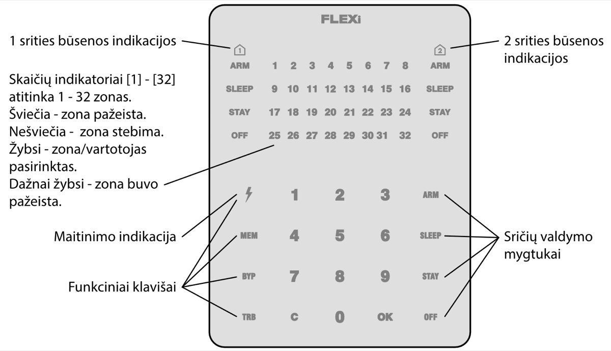 Kai signalizacija išjungta, turi šviesti indikatorius OFF, o saugojimo režimų indikatoriai turi nešviesti.