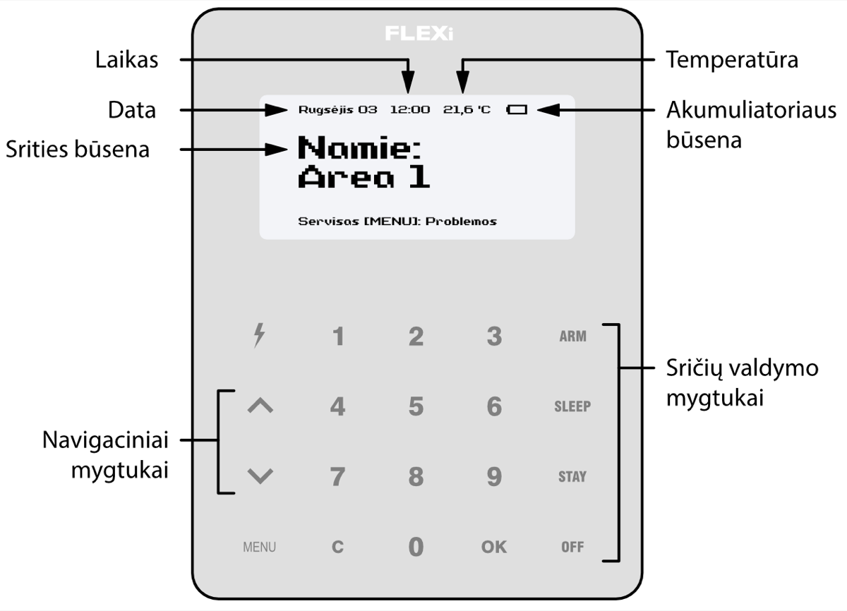 Kai signalizacija išjungta, klaviatūros ekrane atsiras tekstas: Išjungta: Sritis.