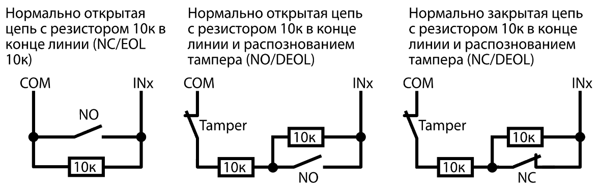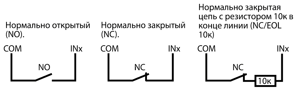 2 входа, типы которых можно задать: NC; NO; NC/EOL; NO/EOL; NC/DEOL; NO/DEOL.
