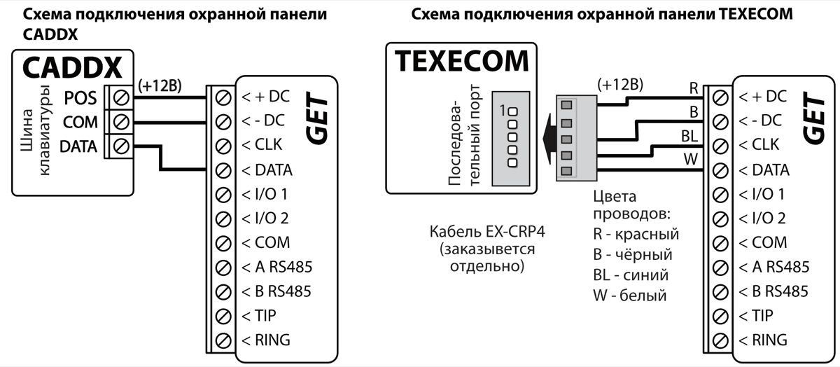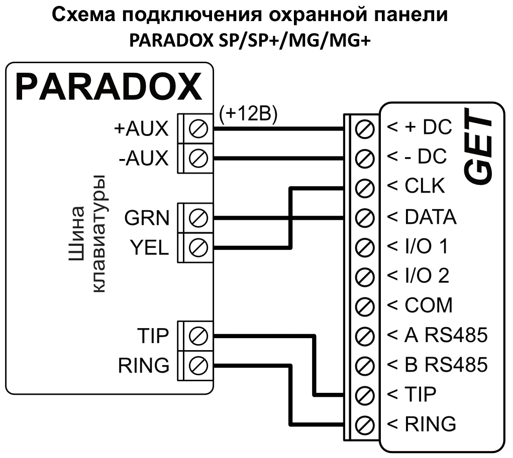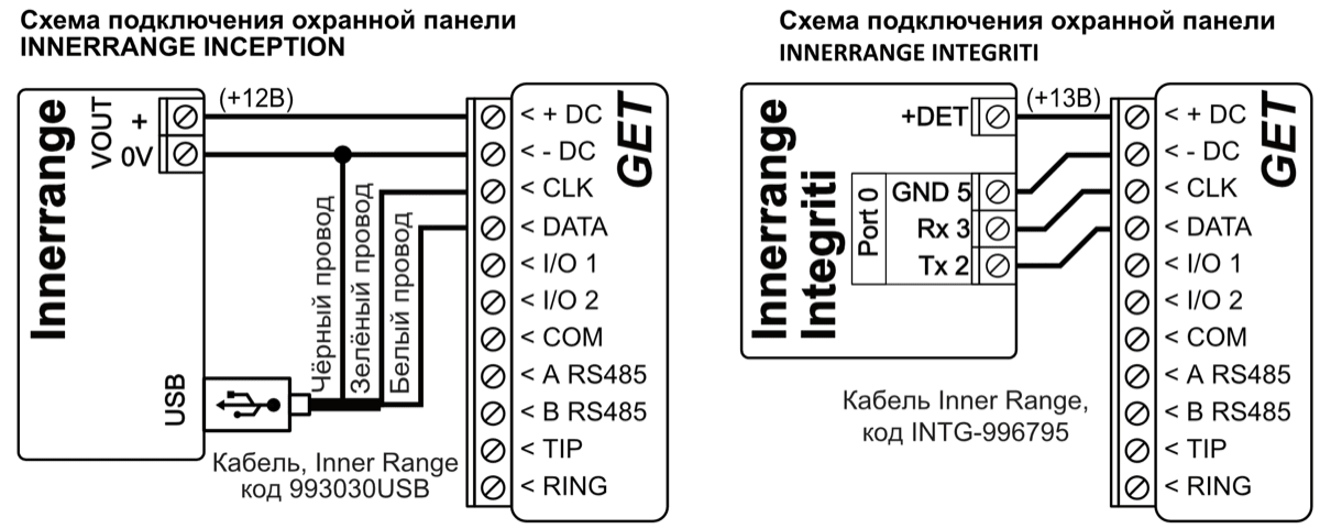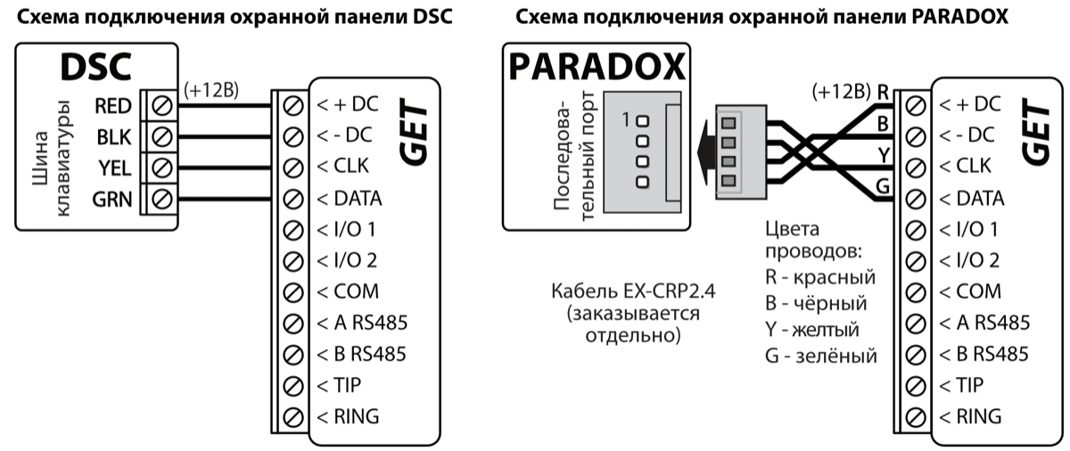 GSM/Ethernet коммуникатор GET может быть напрямую подключен к охранным панелям DSC, Paradox, UTC Interlogix (CADDX), Texecom, Innerrange, Honeywell. Коммуникатор GET также может быть подключен к телефонным коммуникаторам охранных панелей.