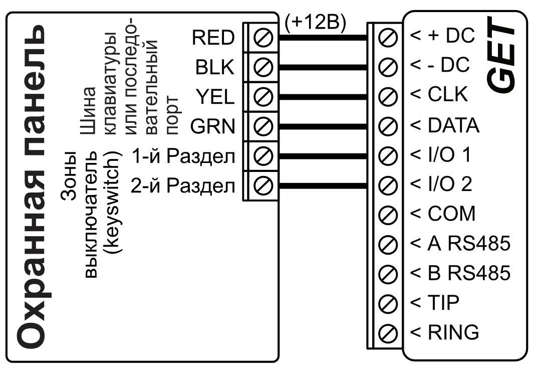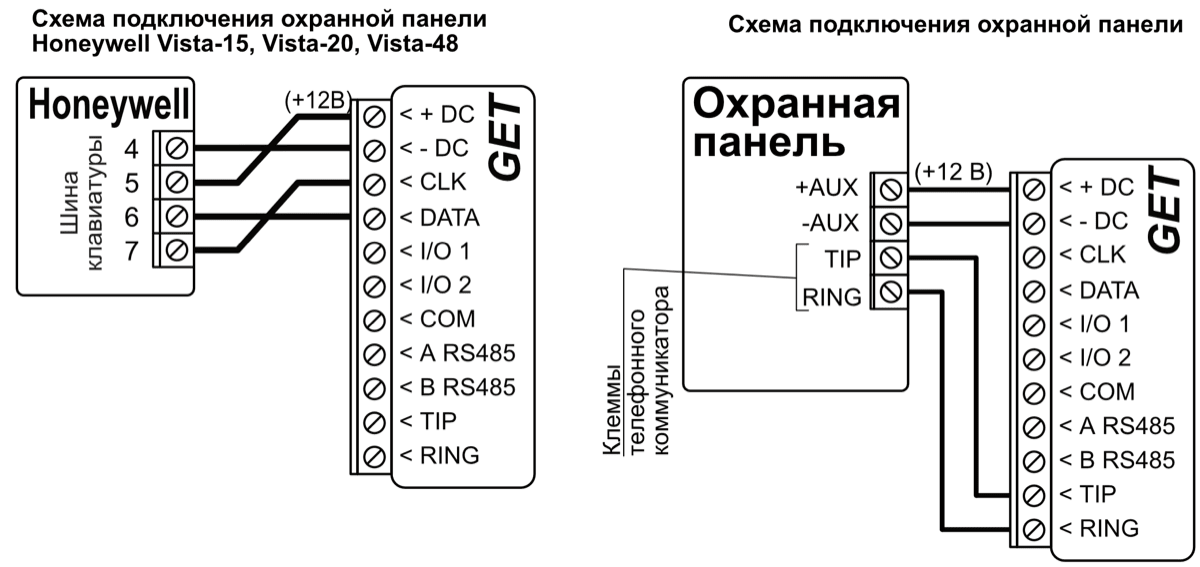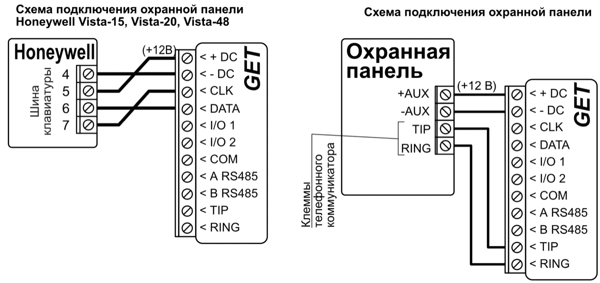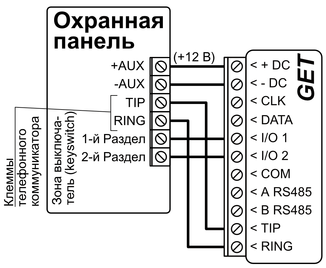 *Охранные панели других производителей подключаются к коммуникатору GET, используя клеммы TIP RING телефонной линии охранной панели.