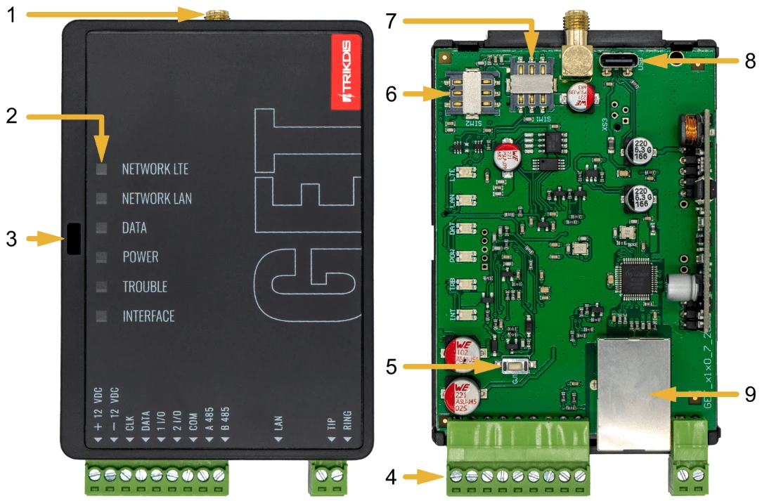 | NETWORK LTE | Светит зеленым и мигает желтым | Коммуникатор подключен к GSM сети. Достаточный уровень сигнала в сети 4G сети является 3 уровень (3 вспышки индикатора желтым цветом) |