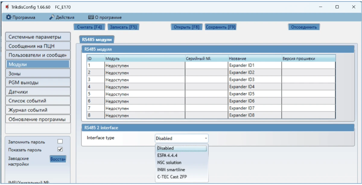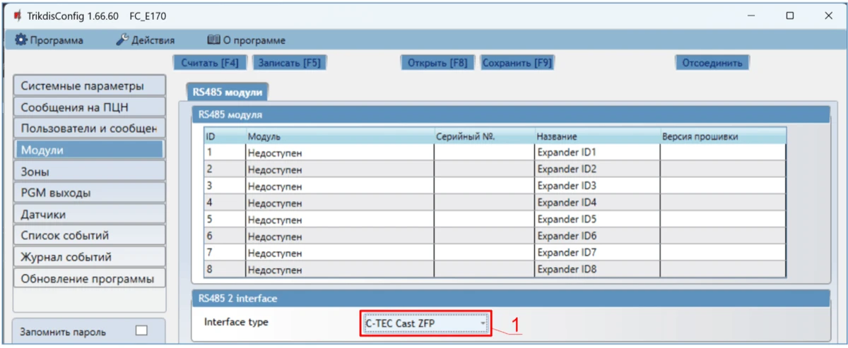 Откроется программное окно FIRECOM. Нажмите кнопку Считать [F4], чтобы были считаны настройки коммуникатора. Если всплывет окно запроса ввода „Кода администратора“, введите 6-значный код администратора. Отметьте поле рядом с „Запомнить пароль“ и нажмите кнопку Записать [F5].