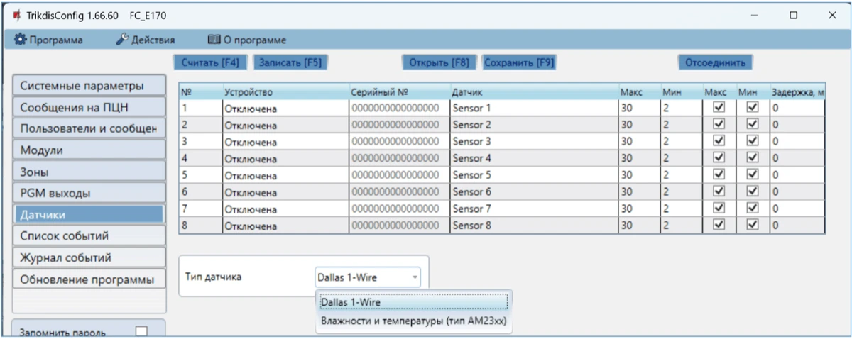 | Наибольшее количество датчиков температуры, подключаемых к шине 1-Wire | 8 (Dallas) или 1 (если применяется датчик серии AM2301) |