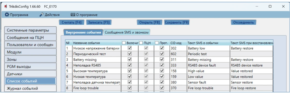 Нажать кнопку „Считать“ – будет считан журнал событий из памяти FIRECOM.