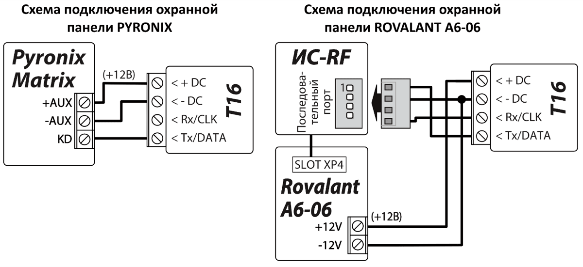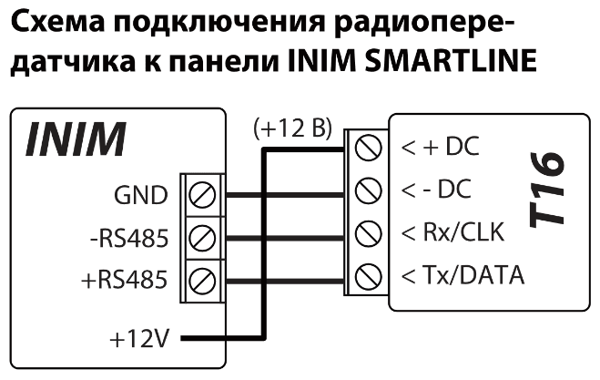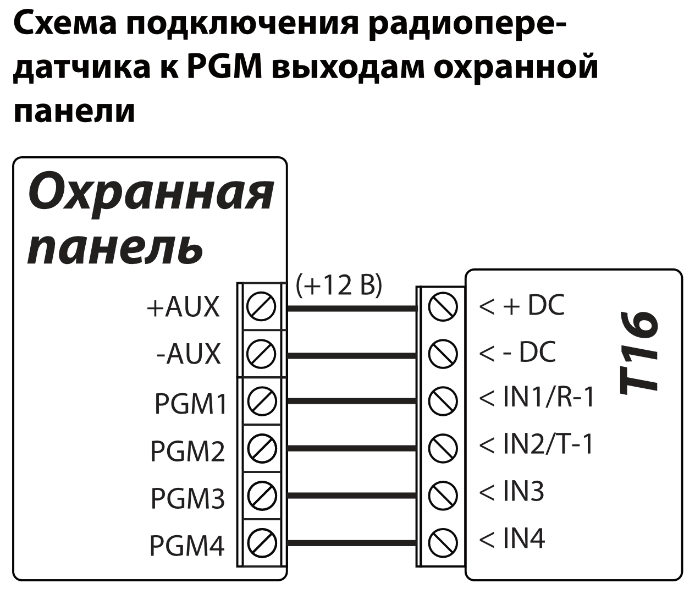 Подключив считыватель ТМ17 к T16, радиопередатчик можно использовать как охранную панель. К входам (IN1 – IN6) можно подключить контакты датчиков охранной системы. Если дополнительно к радиопередатчику подсоединить модуль W485 (или E485), то охранной системой можно управлять дистанционно через компьютерную сеть.