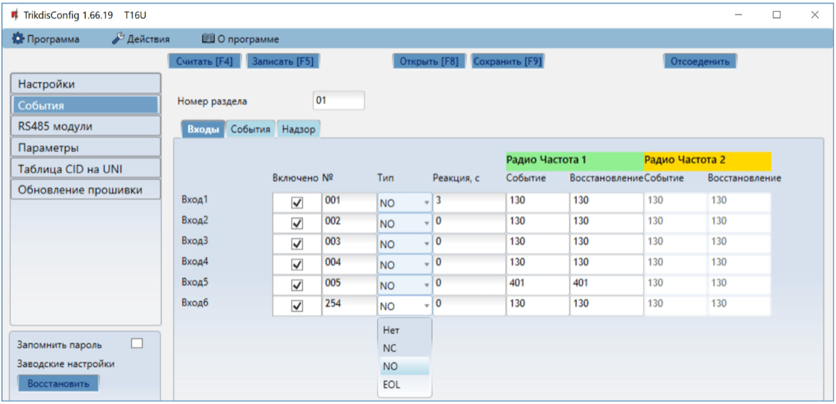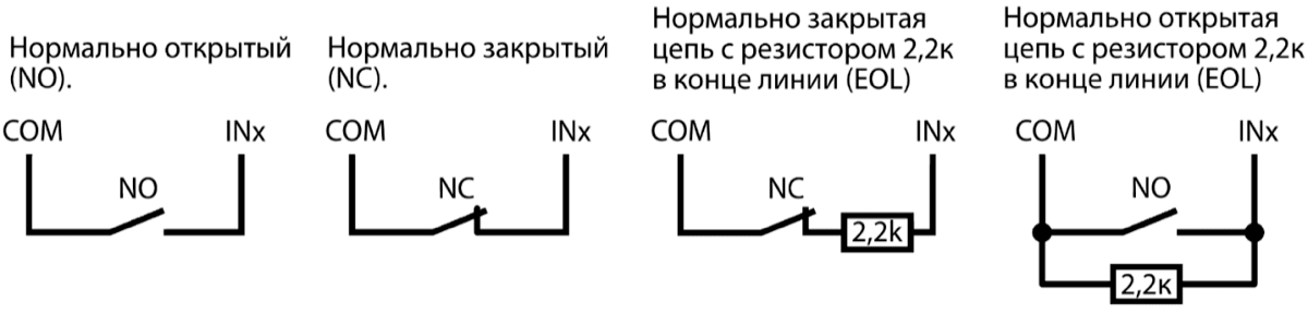 6 входов, тип: NC, NO, EOL (2,2 кΩ). (T16V, T16U)