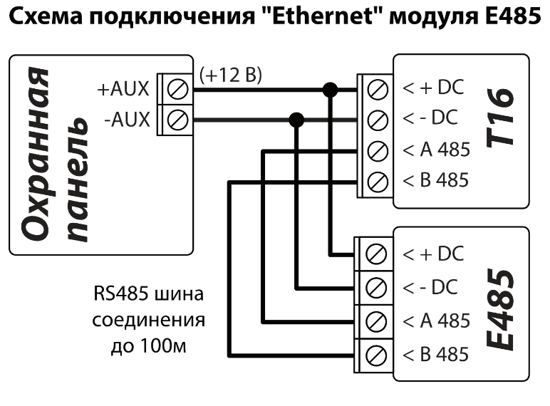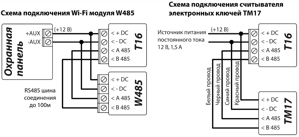 Интерфейс RS485. К интерфейсу RS485 можно подключить модули W485, Е485 и TM17. Для RS485 шины длиной более 1 м используйте кабель витой пары (STP4x2x0,5). Избегайте прокладки кабеля параллельно с силовыми кабелями переменного тока, с антенными кабелями и другими сильными источниками электромагнитных полей.