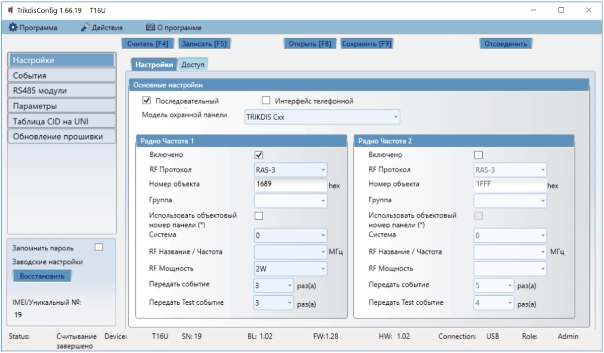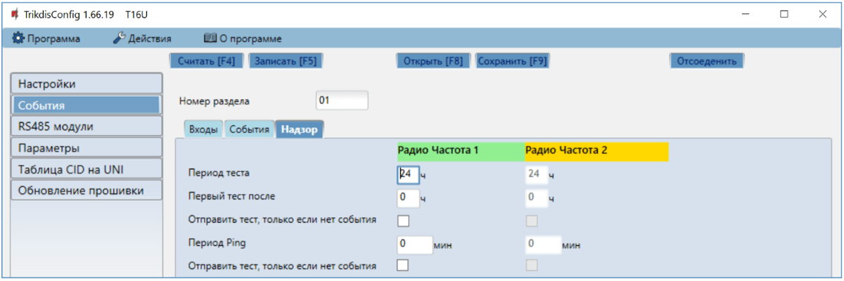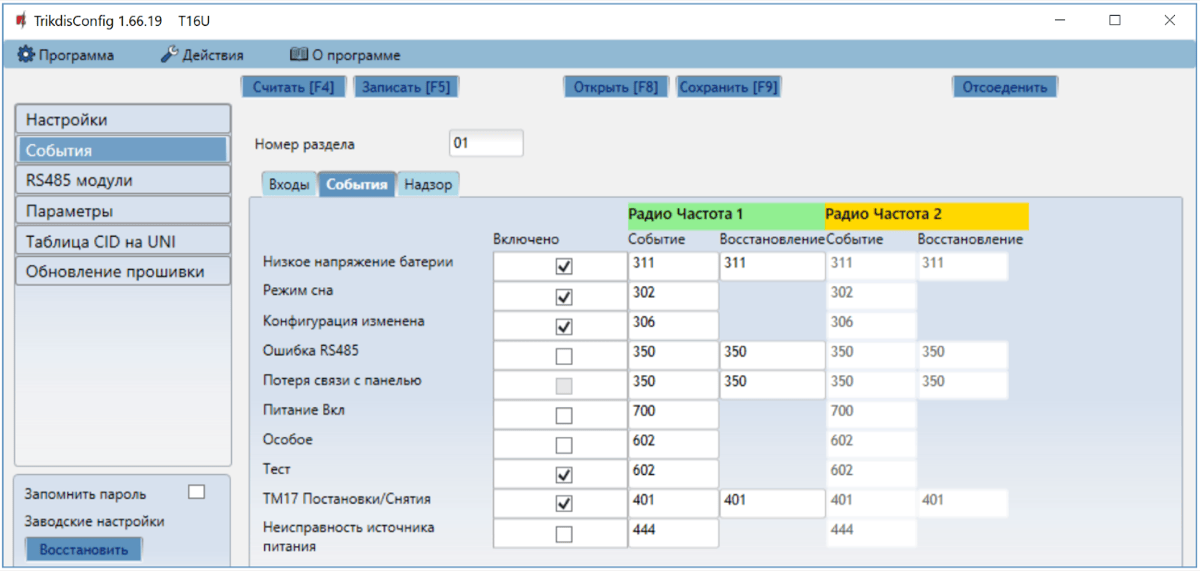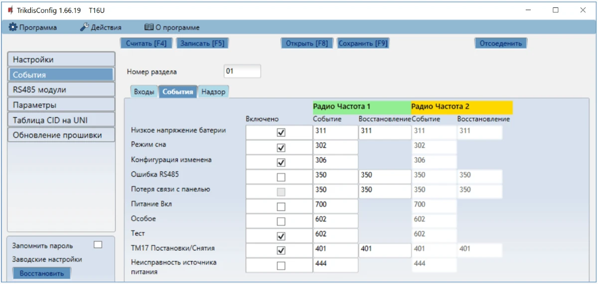 - Радио частота 1 – коды внутренних событий первого радиоканала, которые будут отправляться при Срабатывании/Восстановлении внутреннего события.