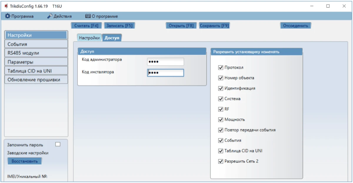 Protegus P/C код – введите код, который позволит удаленно через Protegus осуществлять Постановку/Снятие с охраны. Поле видно при конфигурации изделия через кабель USB (при удаленной конфигурации поле не показывается).