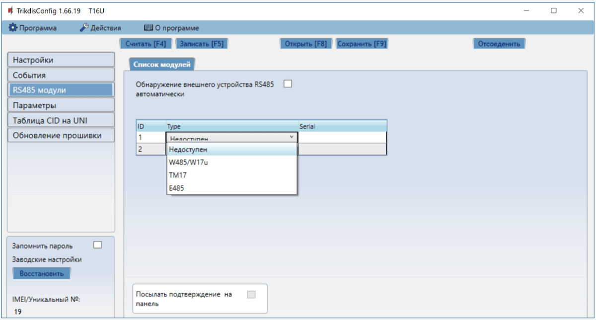 Обнаружение внешнего устройства RS485 автоматически – отметьте поле и будет включено автоматическое распознавание подключенного модуля к шине RS485.