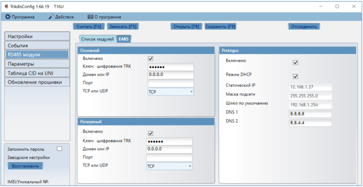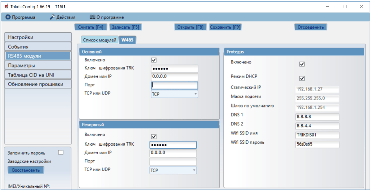 Включено – отметив поле, будет включен Protegus сервис. Т16 сможет обмениваться данными с приложением Protegus и с TrikdisConfig можно будет удаленно выполнить конфигурацию.