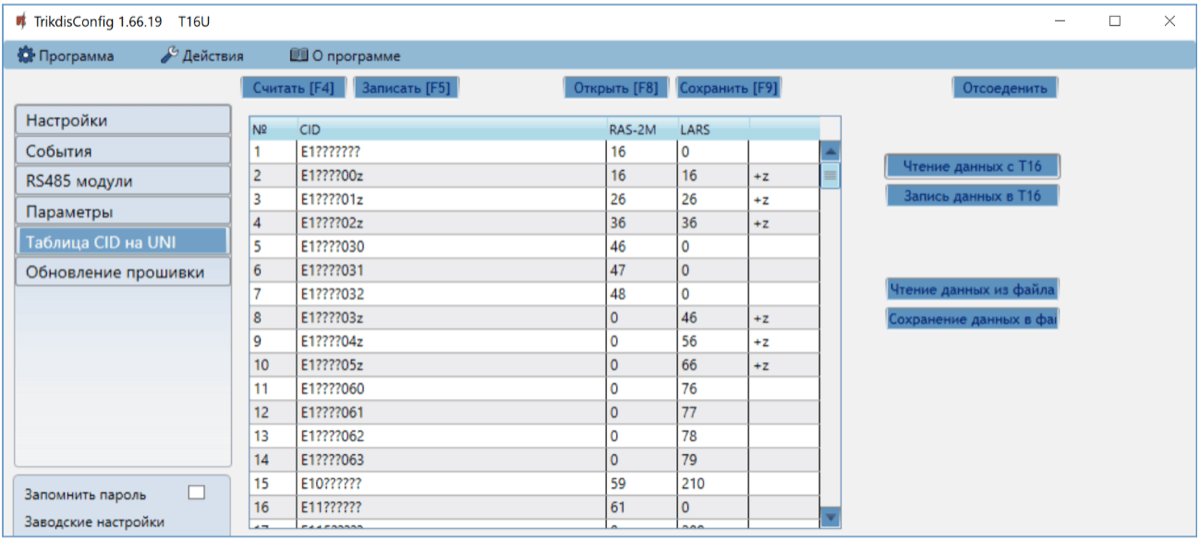 Contact ID коды, принимаемые от охранной панели, конвертируются в коды радиосистемы (RAS2M, LARS). Только Сontact ID сообщения, которые описаны в таблице в столбце CID, будут конвертированы в коды радиосистемы и отправлены на ПЦН. Символ „?“ представляет любое число в позиции. Символ „z“ указывает, что число в позиции добавляется к основному коду радиосистемы. Таблица редактируется, но делайте это ответственно и только в том случае, если это действительно необходимо. Если в таблице будут ошибки, то система будет работать неправильно.