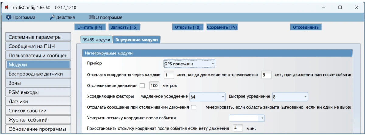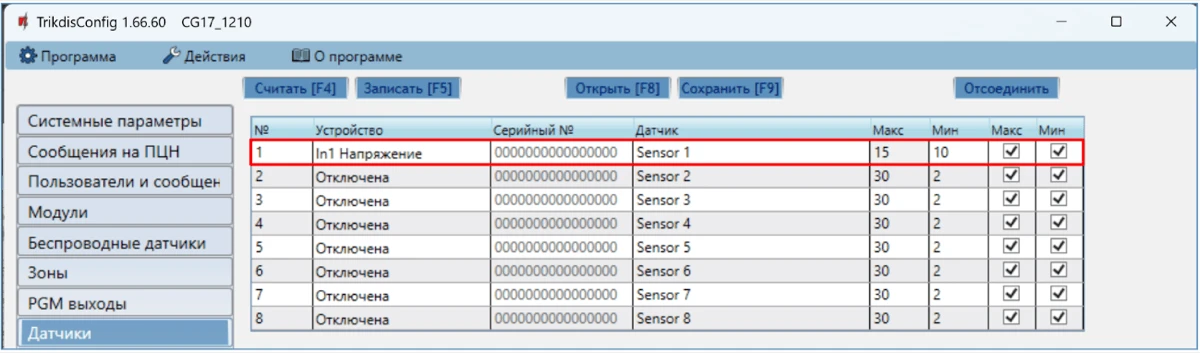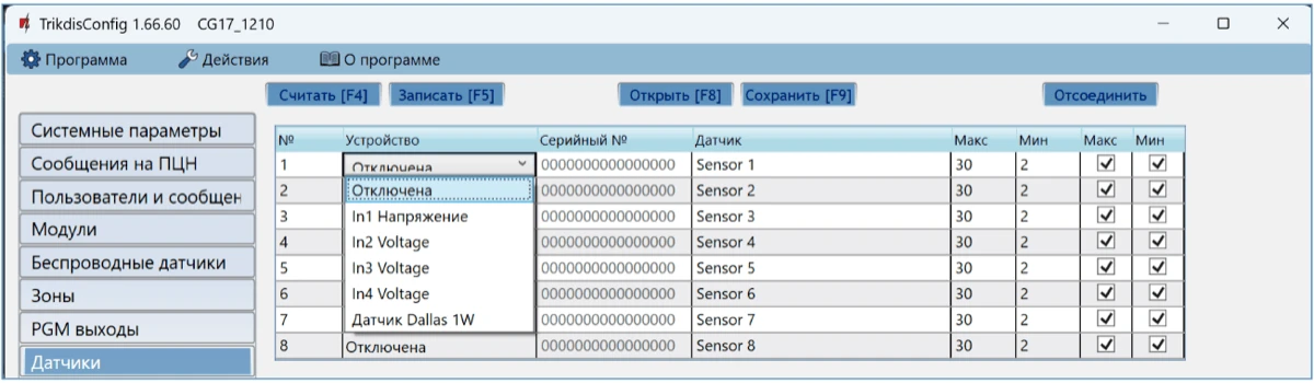 Настройка осуществляется программой TrikdisConfig, подключив CG17 к компьютеру кабелем USB Mini-B или удаленно.
