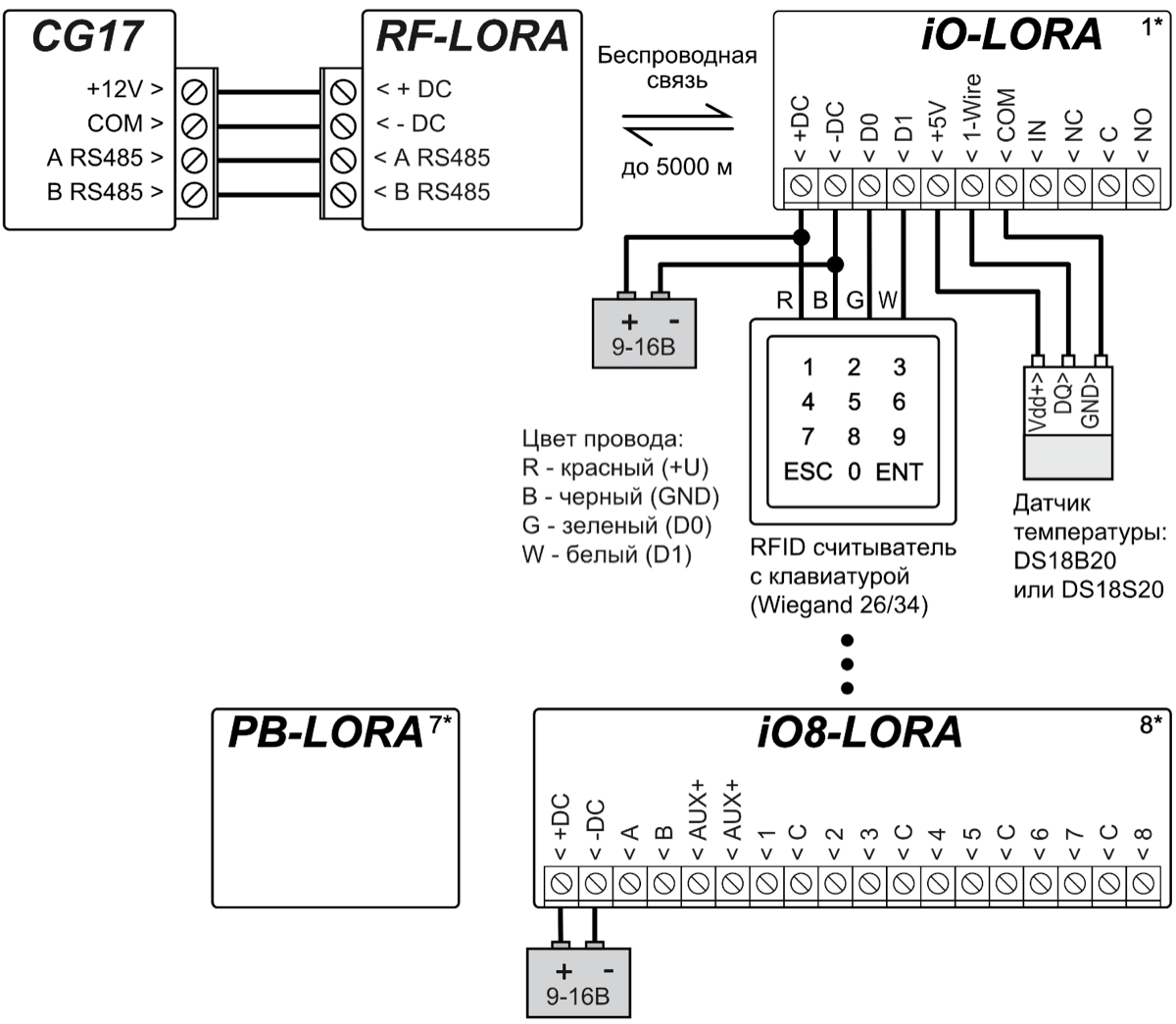 Используя расширители серии iO, LORA количество входов (IN) и выходов (OUT) может быть увеличено до 12.