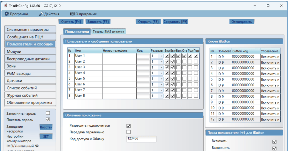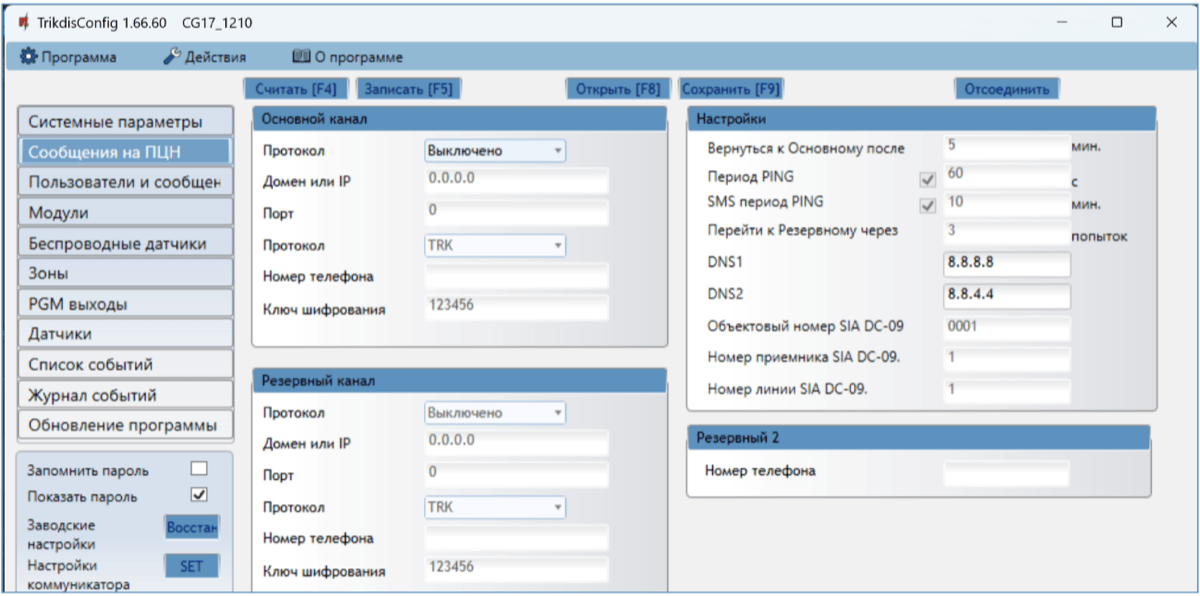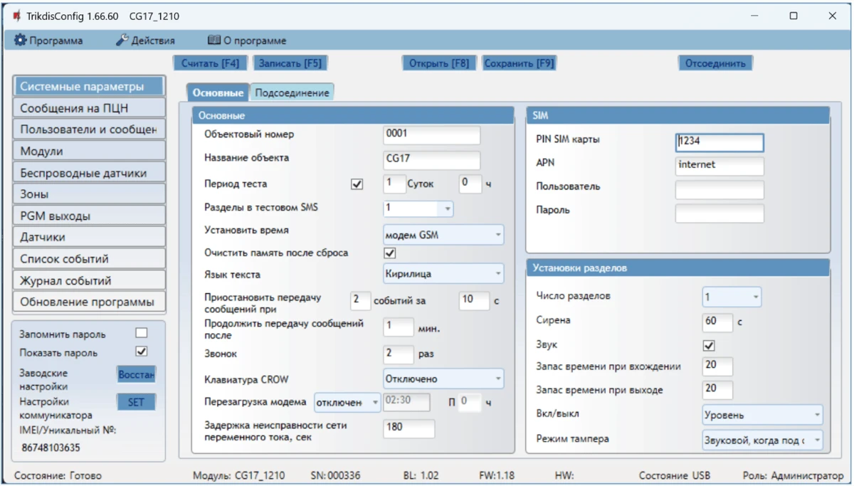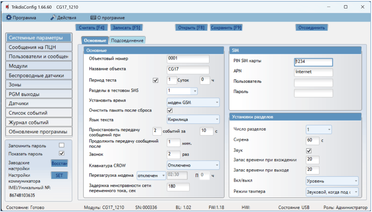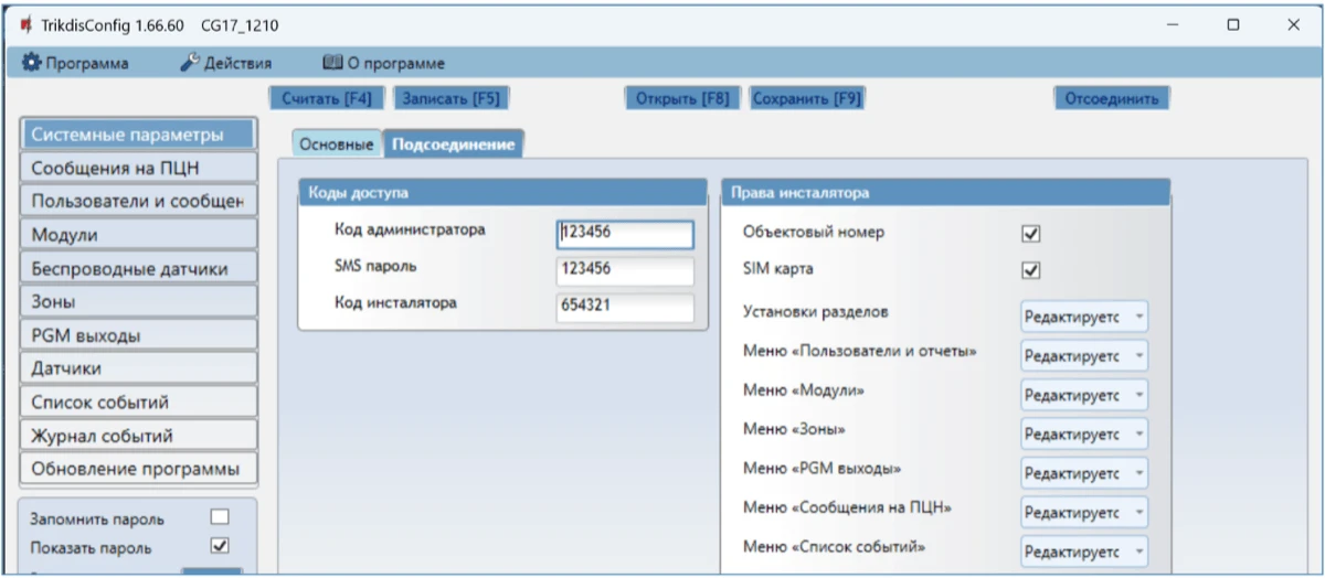 Откроется программное окно CG17. Нажмите кнопку Считать [F4], чтобы были считаны настройки CG17. Если всплывет окно запроса ввода „Кода администратора“, введите 6-значный код администратора. Отметьте поле рядом с „Запомнить пароль“ и нажмите кнопку Записать [F5].