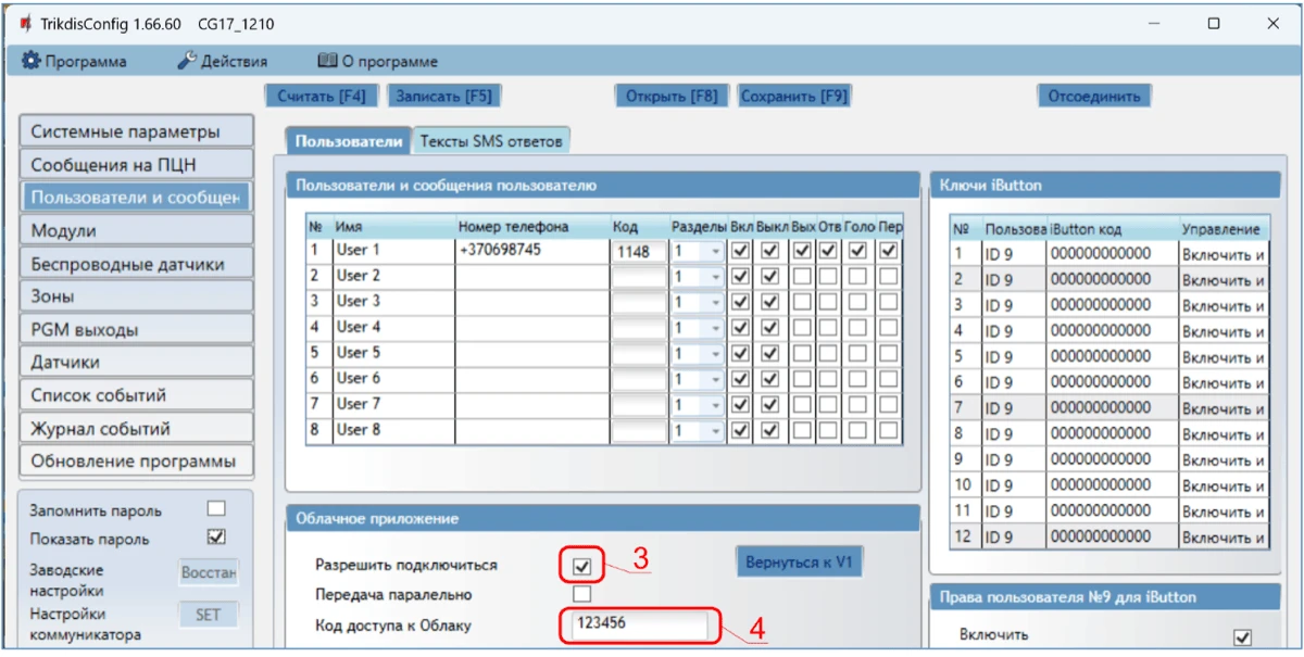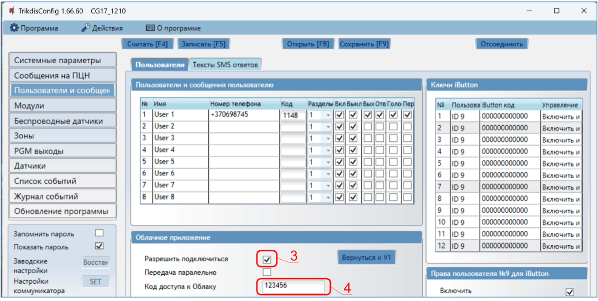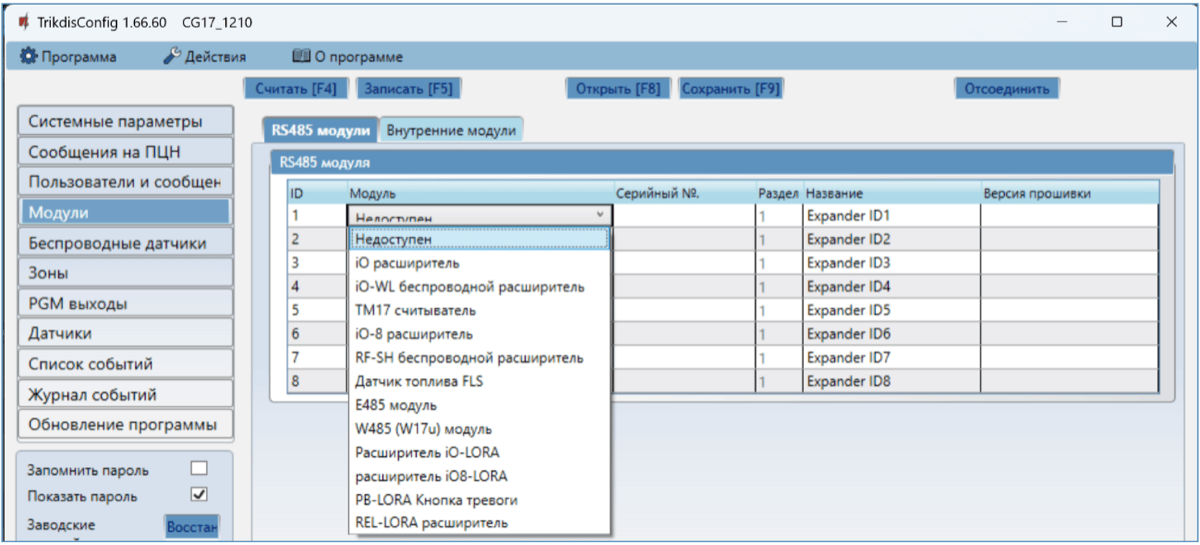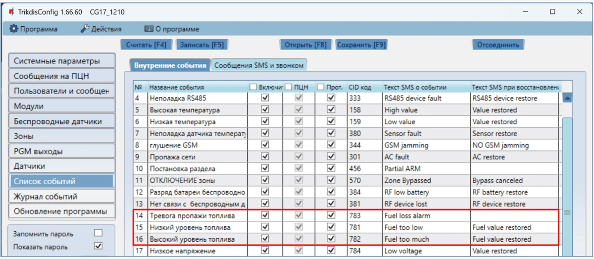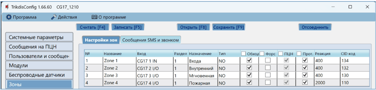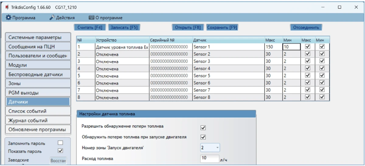 Откроется программное окно CG17. Нажмите кнопку Считать [F4], чтобы были считаны настройки CG17. Если всплывет окно запроса ввода „Кода администратора“, введите 6-значный код администратора. Отметьте поле рядом с „Запомнить пароль“ и нажмите кнопку Записать [F5].