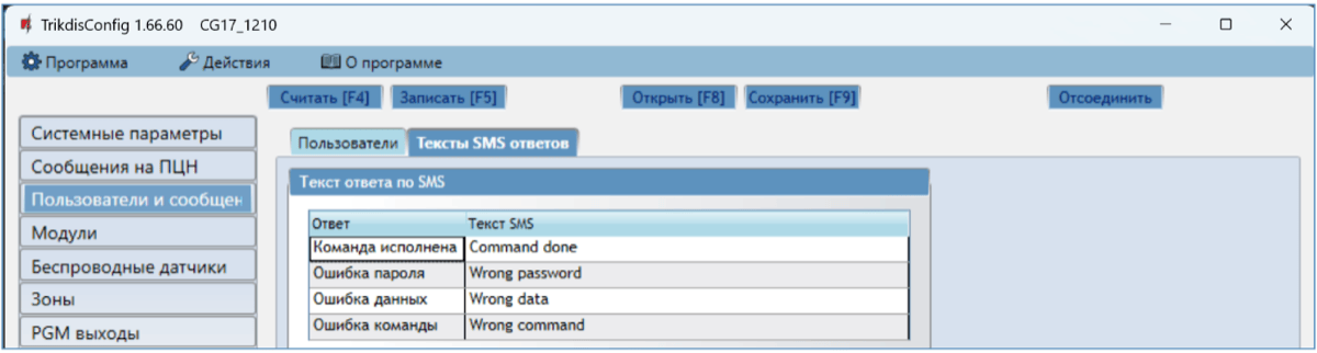 | TXTR | Z1= | Редактирование текста SMS сообщения при восстановлении зоны охранной сигнализации. Например: TXTR 123456 Z1=Restore Zone1 |