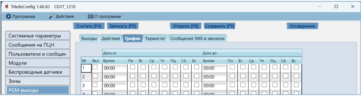| [2][№ выхода][#][№ состояния][*] | Управления выбранного выхода OUT | Управление выбранным выходом OUT. Состояние: [0] – выключить выход; [1] – включить выход; [2] – выключить выход на продолжительность импульса; [3] – включить выход на продолжительность импульса (продолжительность импульса задается в программе TrikdisConfig „PGM выходы“ ->“Выходы“). [] – символ окончания кода. Например (включить выход 5OUT): 21#1 Например (включить выход 6OUT на продолжительность импульса): 22#3* |