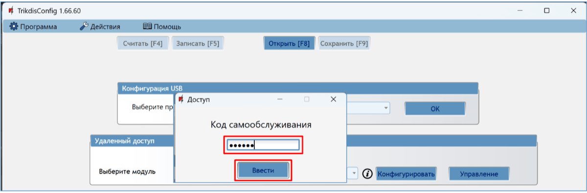 Введите код самообслуживания (заводской – 123456) и нажмите „Ввести“.