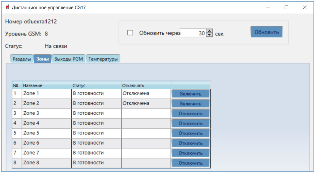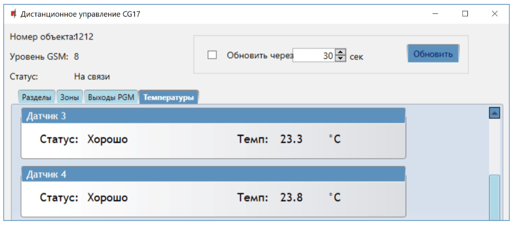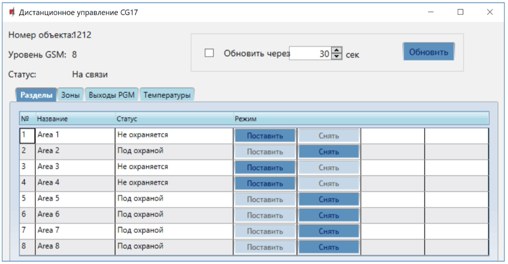 Появится программное окно дистанционного управления, у котором можно будет управлять „Разделами“ охранной сигнализации, наблюдать за статусом „Зон“, управлять „Выходами PGM“, контролировать „Температуру“.