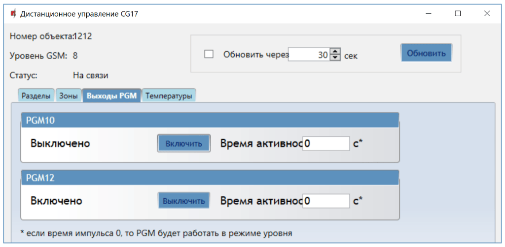 - Закладка „Выходы PGM“. В данном окне можете управлять выходами PGM, которым установлен режим „Удаленное управление“.