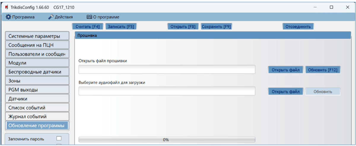 В программе TrikdisConfig откройте окно „Обновление программы“.