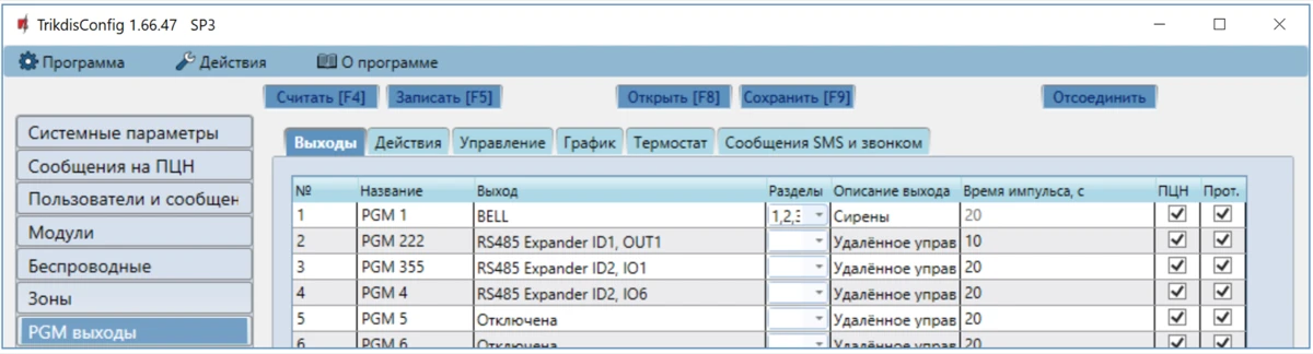- В закладке "PGM выходы" сделайте настройки PGM выходам расширителя.